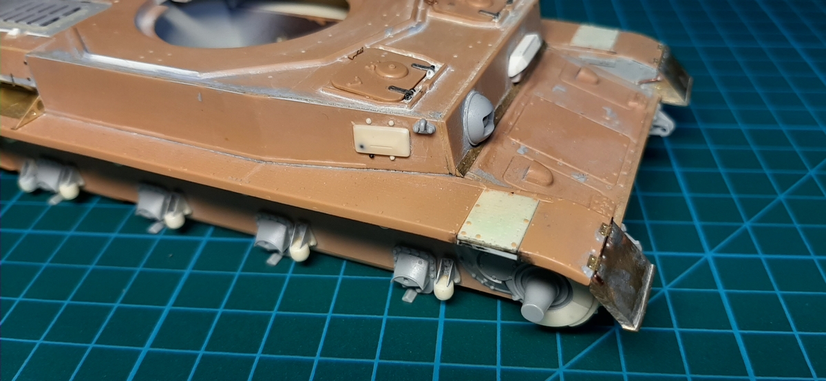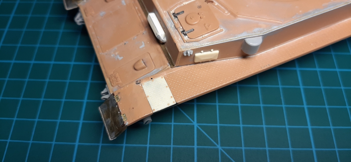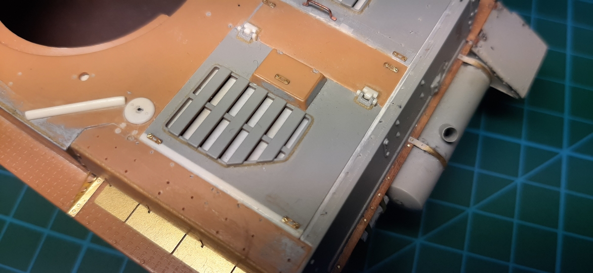 Для начала различными шпатлевками законопатил вездесущие следы от толкателей. Потом начал долго и нудно шкурить поверхность чтобы их выровнять (а в разных труднодоступных местах это - вобще одно удовольствие). Все заклепки и болты естественно в процессе снеслись и я их восстановил заново с помощью Мастерклуба и Абера. Аберовская же травленка помогла сымитировать планки крепления и прямоугольный лючок.Имитацию механизма натяжения полностью выпилил и решил сделать заново - благо набор травленки предполагал ее изготовление.