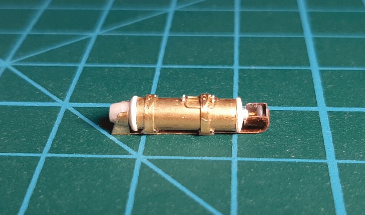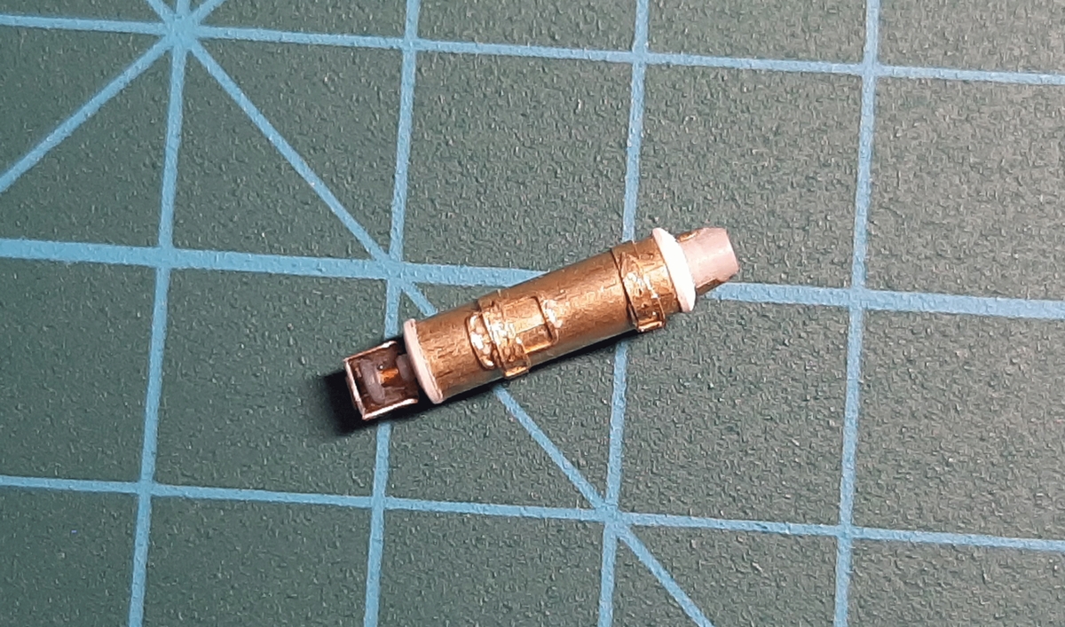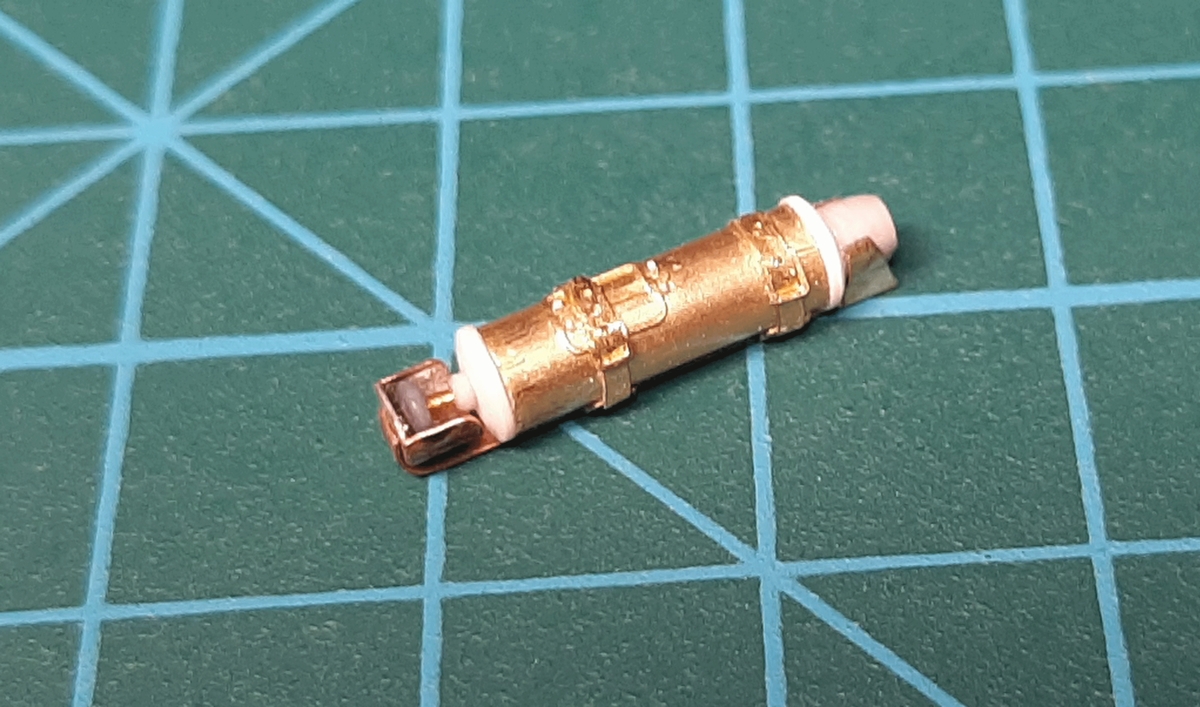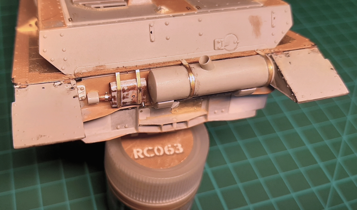 13 Выхлопная башенного привода - ажурная деталь. Сточил родную, потом обтянул листовой медью так, чтобы оставались небольшие выступы по бокам, как на оригинале. Это придало им масштабную величину, в отличие даже от драгоновских. Полосы крепления - абер, небольшие патрубки - медицинская игла, труба - медная проволока, бронировка выхода трубы - драгон.