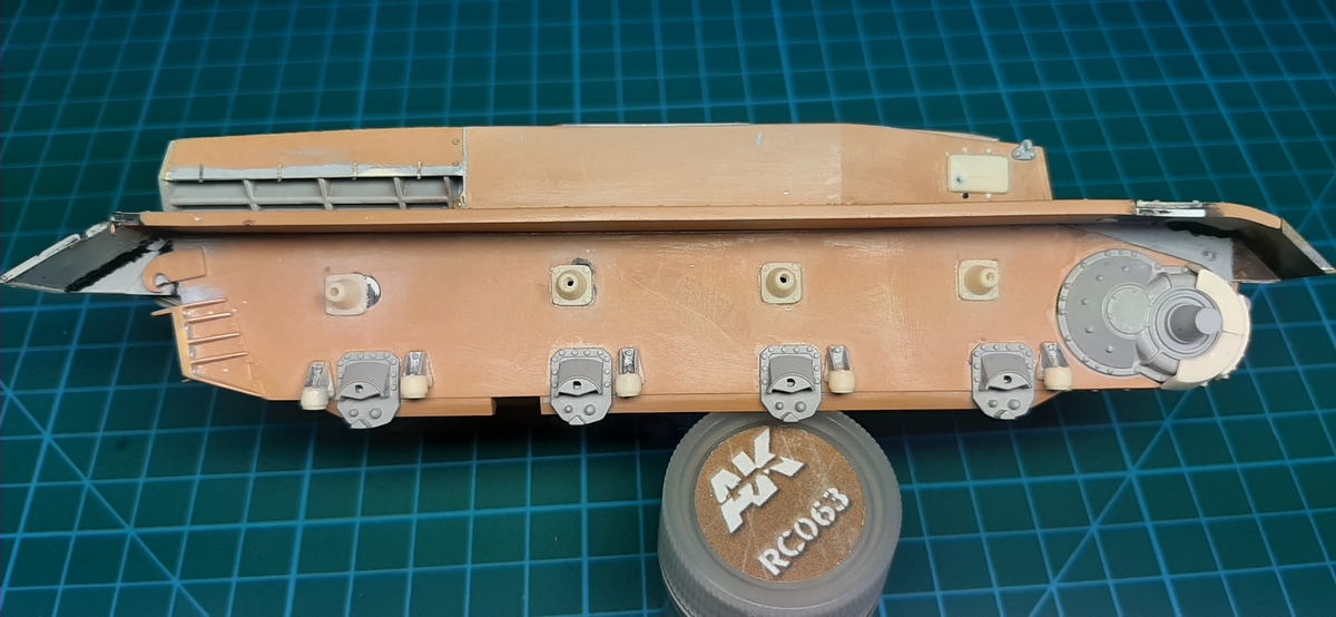 1. Перепилена ходовка, Снесено все что от (лукавого) Итала. Картеры ведущего колеса от Драгона, от него же и крепления тележек катков. Крепления демпферов и сами демпферы, как и крепления поддерживающих катков и бронировка картеров - смоляные копии Драгона. Крепления демпферов пришлось немного доработать.