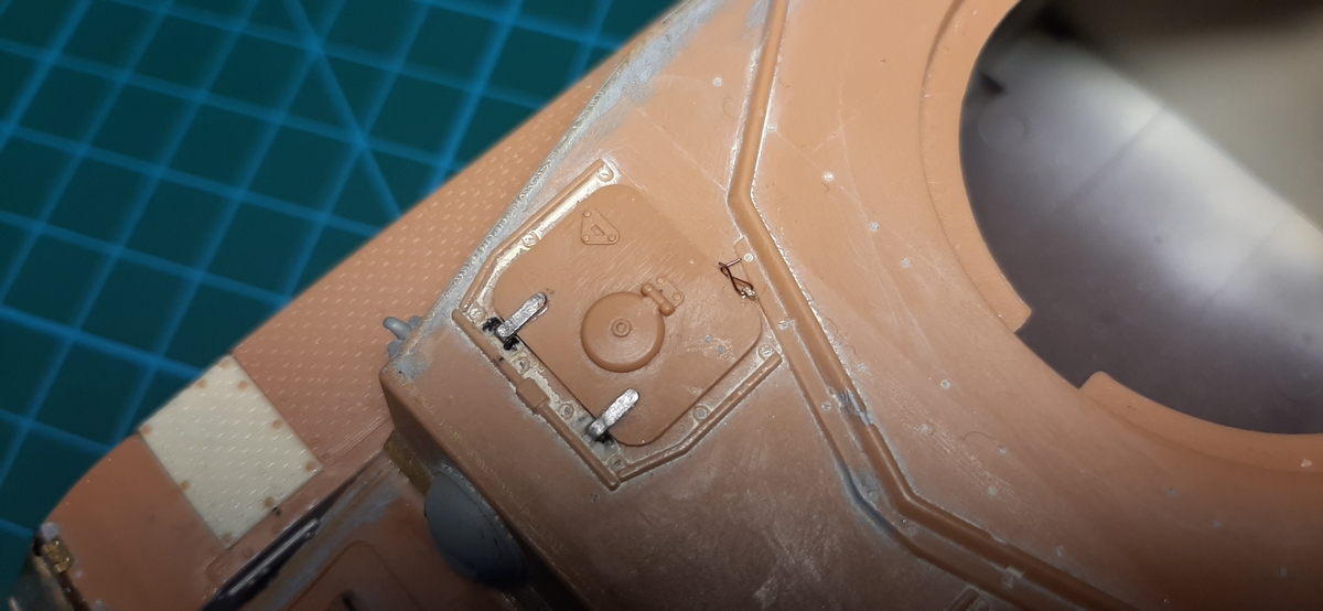 7. Люки мехвода и радиста-пулеметчика изрядно дорабатывались. Сделаны рабочими с прицелом на установку в последующем экипажа. Петли на корпусе сделаны заново из пластика, а на люках- паянная латунь, иначе при их толщине пластик ничего бы не держал вобще.
