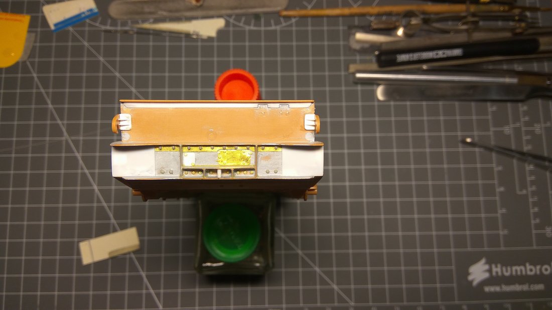 . Где-то пришлось стачивать корпус модели, где-то наращивать люки...Крепления люков были нещадно уничтожены, поэтому делались с нуля и обваривались двухкомпоненткой. Как и жалюзи люков. Замочные скважины - аберовские из одноименного набора. Везде по корпусу, по чертежам, был восстановлен рельеф - технические отверстия, выемки для винтов, сварные швы из двухкомпонентки. Винты были сделаны из тянутого литника и вклеены на место. Геометрия отбортовки башни изменена, сделаны выточки под слив воды. Крюки для фрахтовки танка - пластик Драгон.