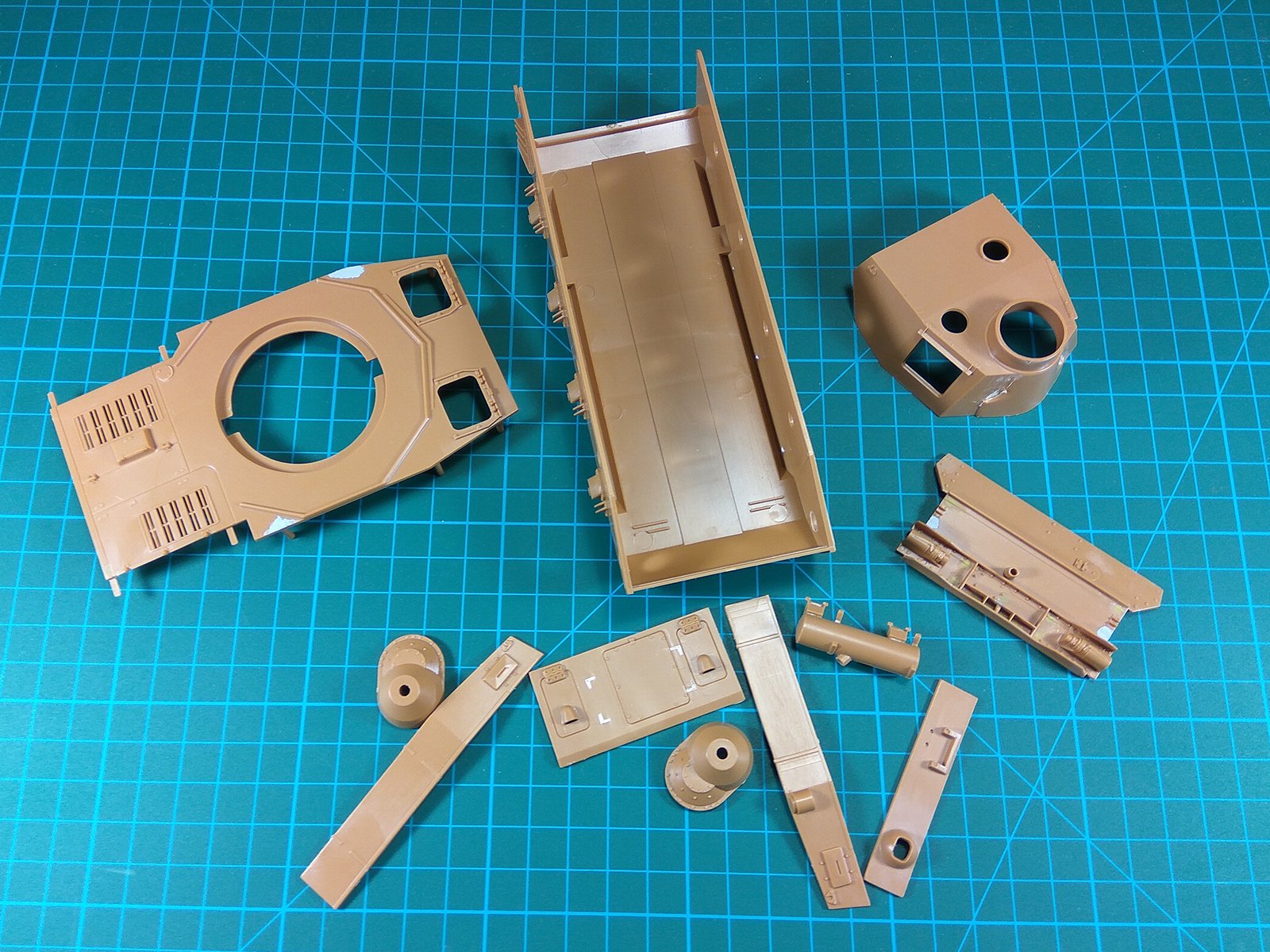На сегодняшний день начало сборки - начал приводить детали в божеский вид. Задняя бронеплита - просто боль всей модели. Это и грустный механизм натяжения, на себя не похожий и следы толкателей в самых интимных местах и отсутствие мелких деталей и много еще чего...