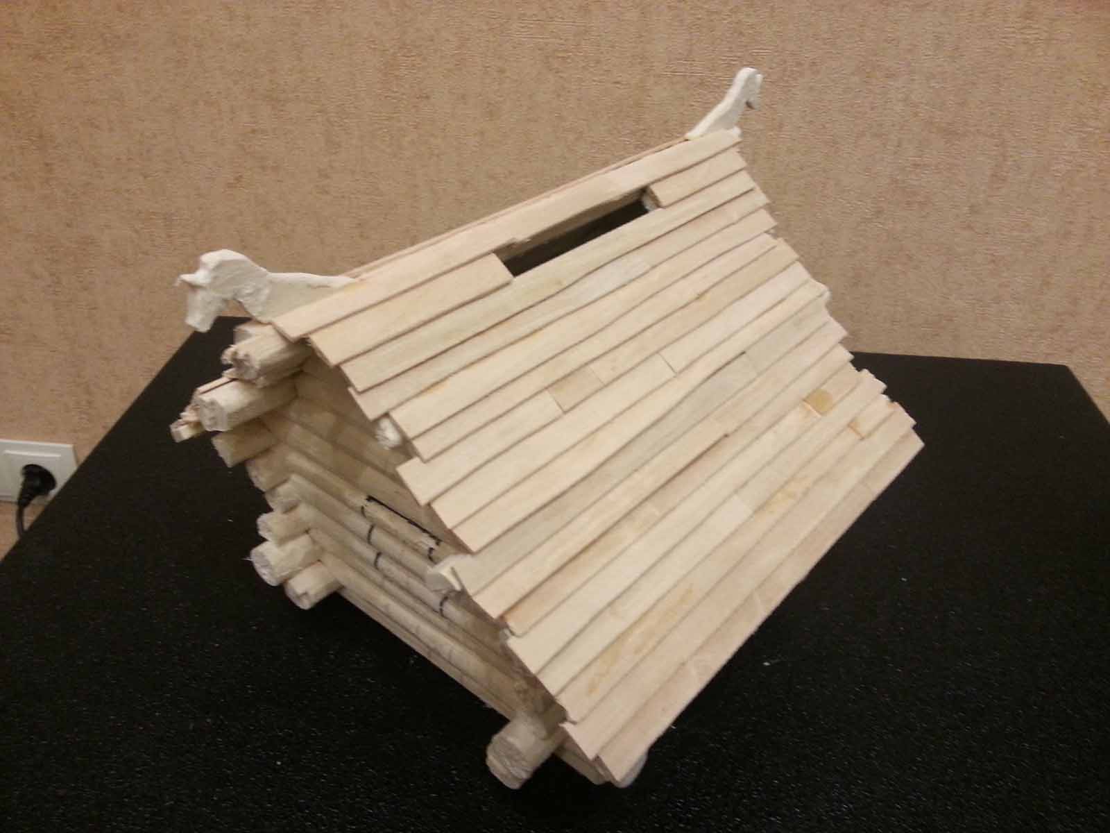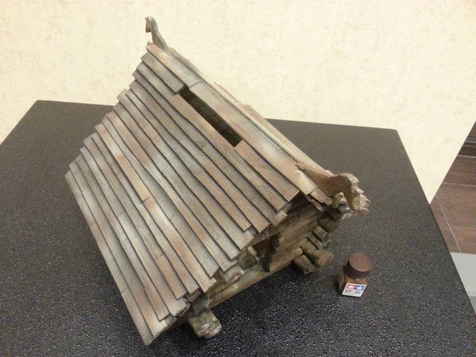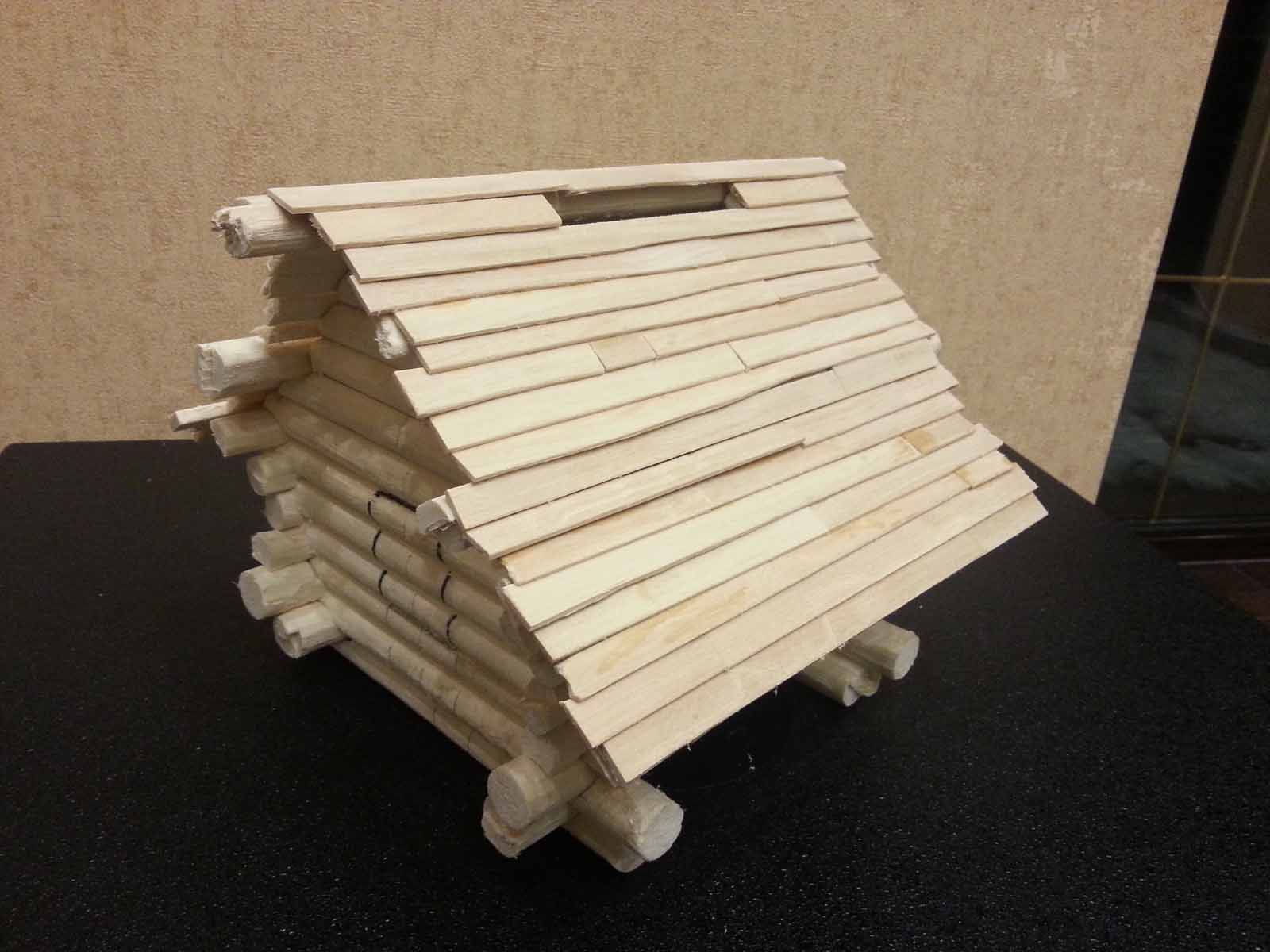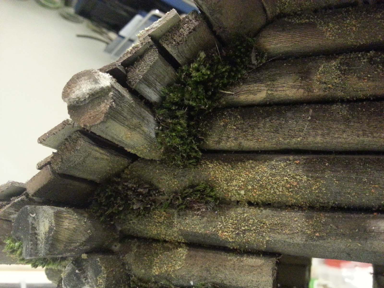 Достроил стены. Положил на них 3 прогона (бревна. Держащие крышу и выступающие наружу). Положил сплошной ряд обрешетки и на нее внахлест доски покрытия