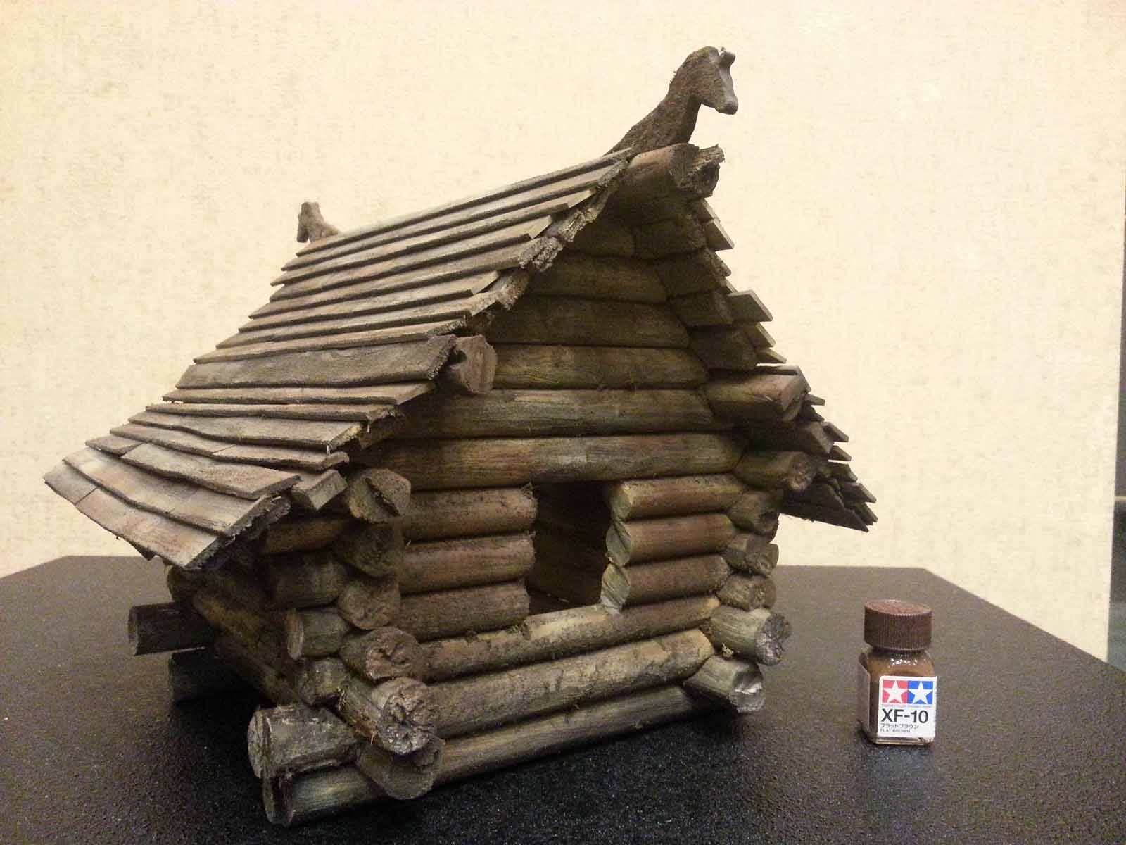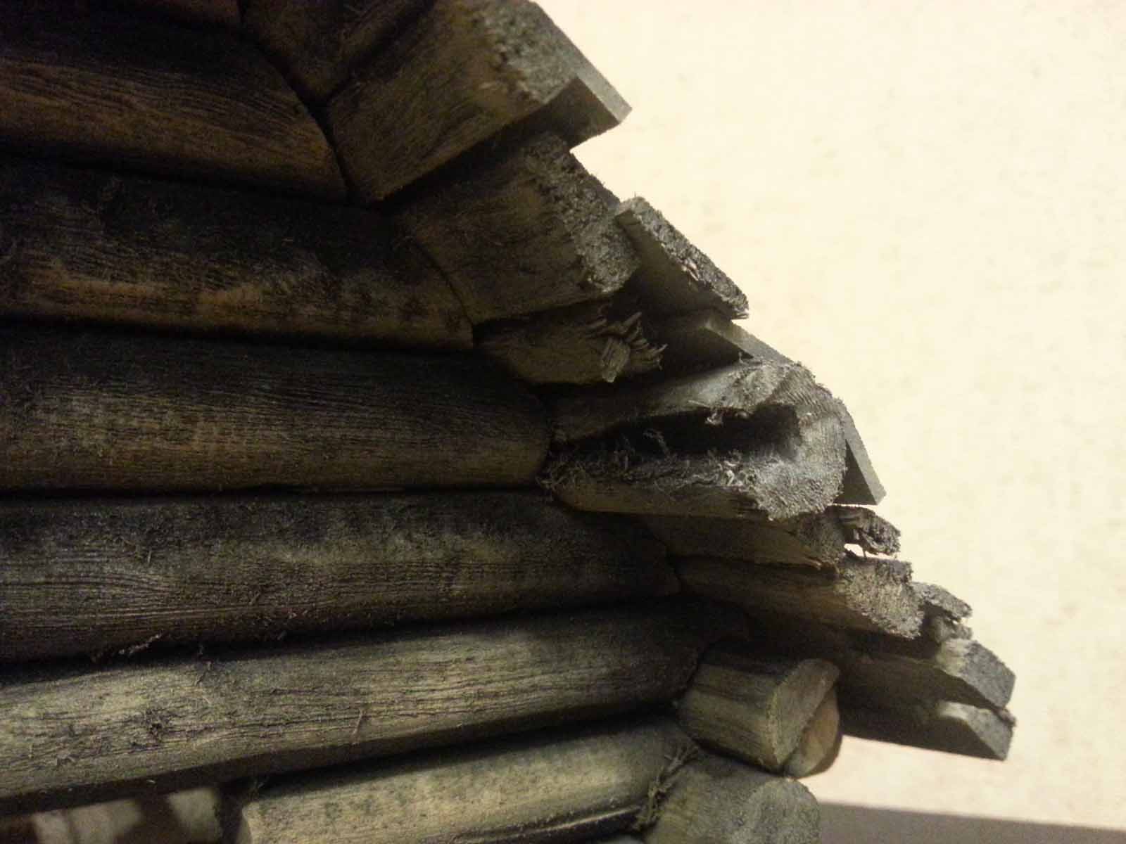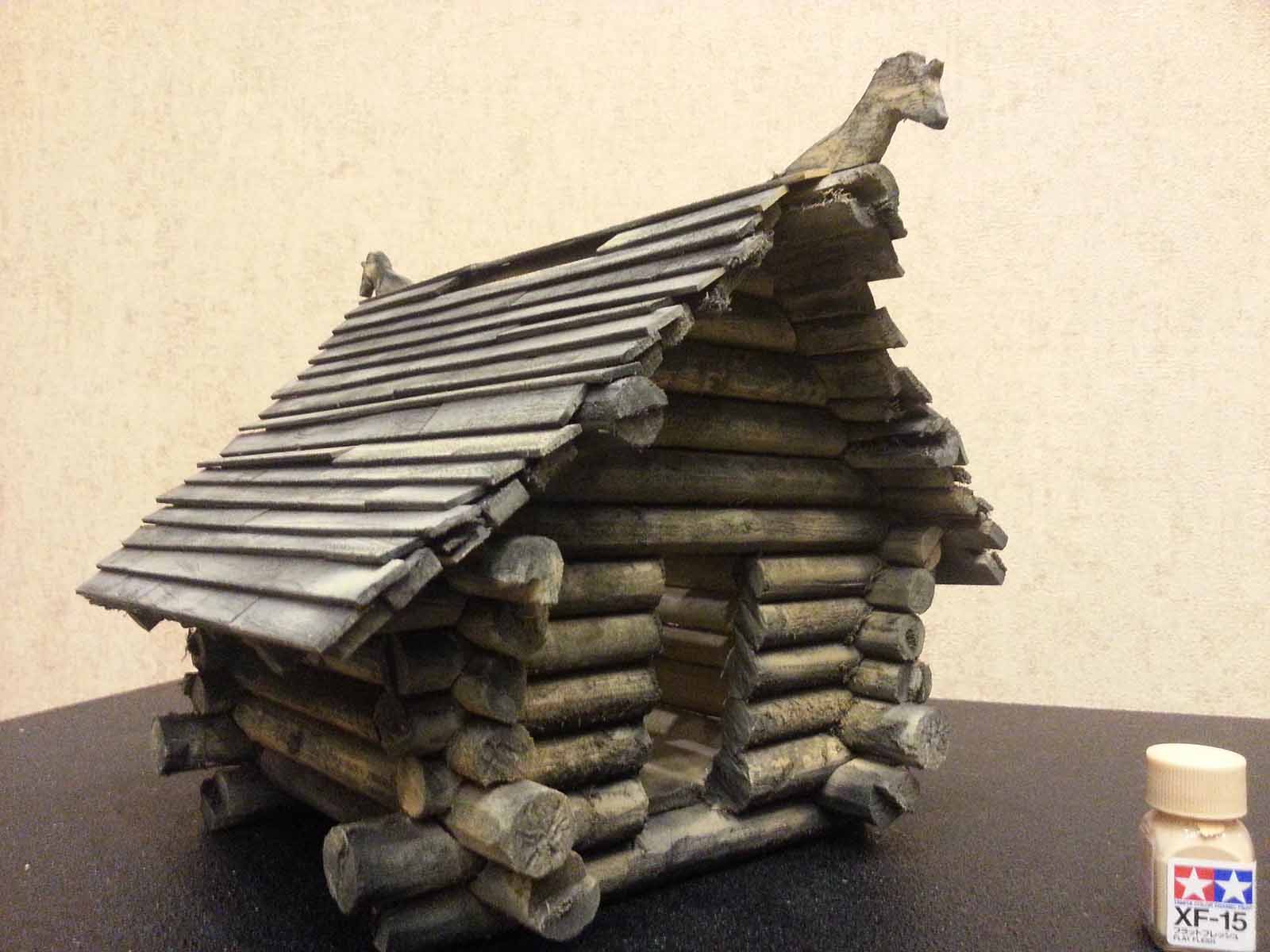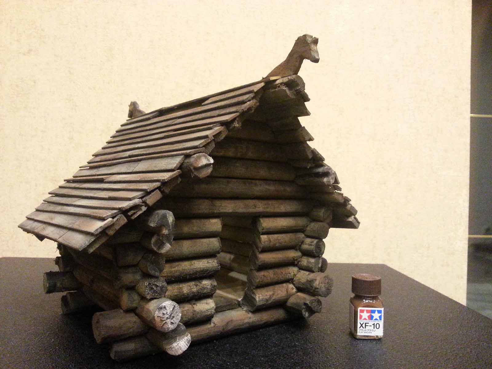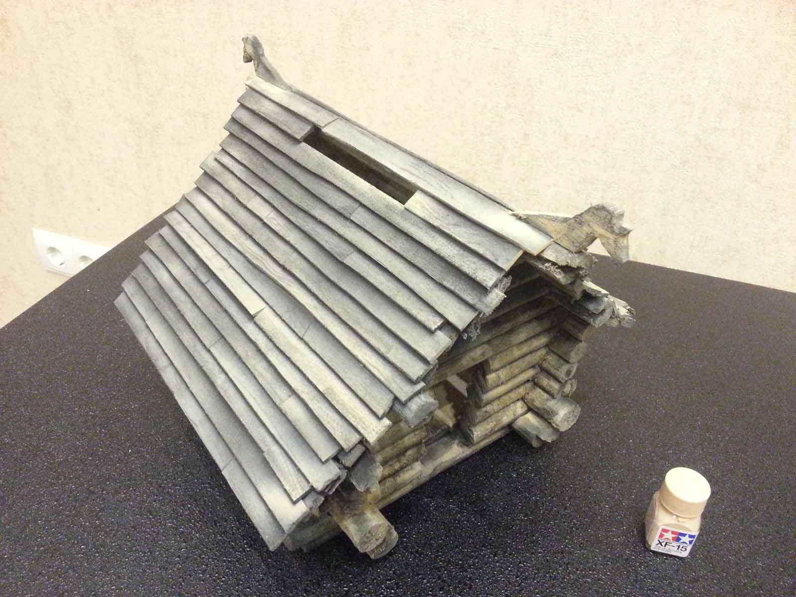 Достроил стены. Положил на них 3 прогона (бревна. Держащие крышу и выступающие наружу). Положил сплошной ряд обрешетки и на нее внахлест доски покрытия