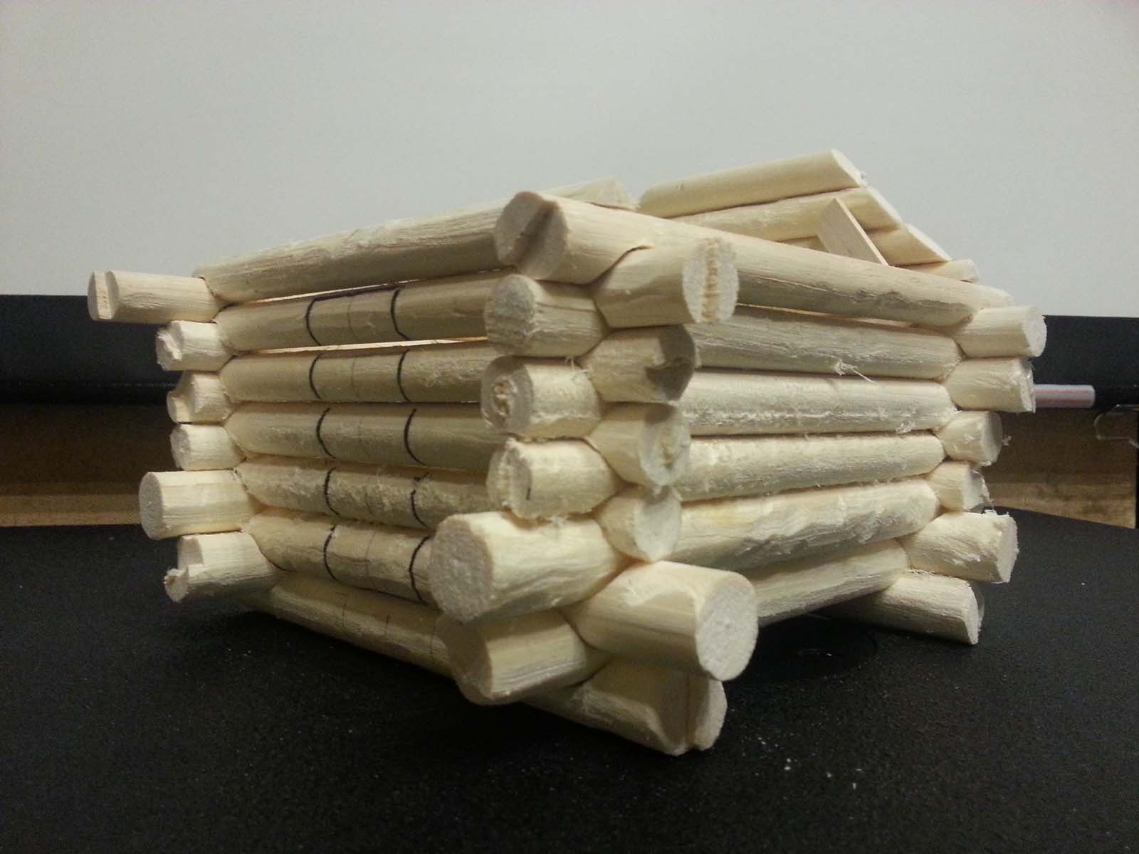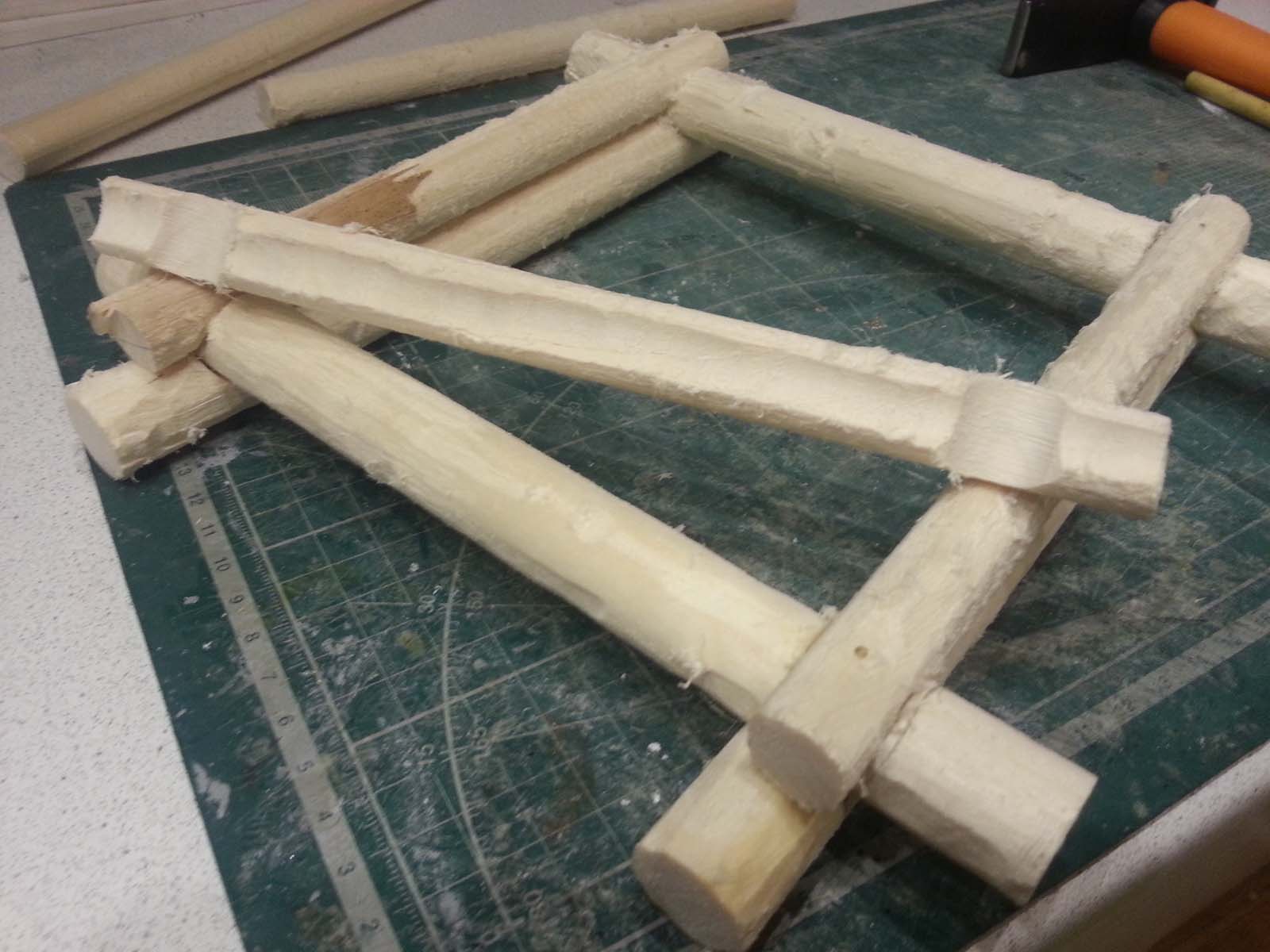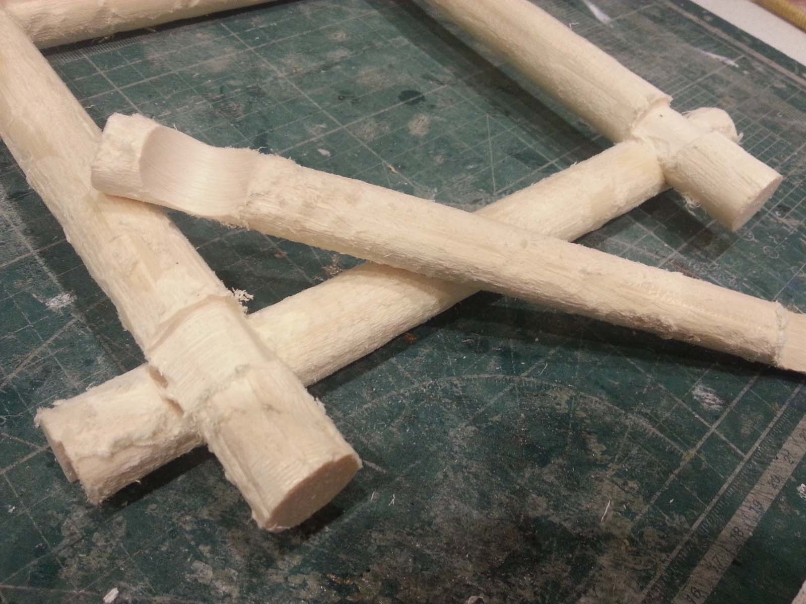 В качестве материала взяты деревянные круглые рейки диаметром 16-20 мм. Обработка - обдирочной фрезой