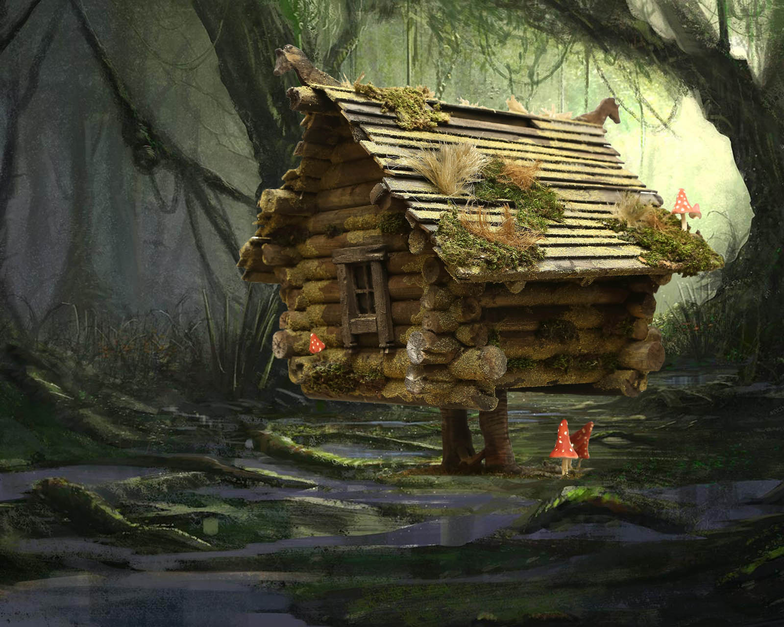 подойдут и просто имитация небольших колод на которые все это опирается ( как и строили в старину), а неровный земляной уровень из которого они (опоры) будут едва проглядывать, только подчеркнет всю эту красоту. Решать Вам.