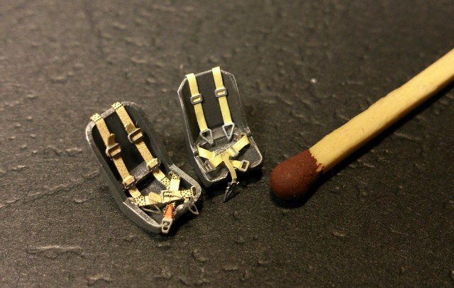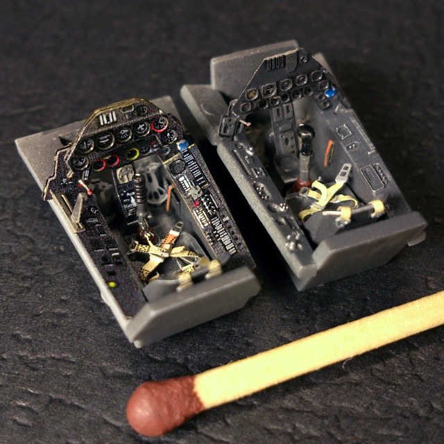 Меж тем кабинеты... Честно, не люблю окрашенный Эдуард (слева), придется искать на будущее что-то без краски. Всё достаточно стандартно, грани немного выделены полирующимся металликом и смывка (по приборке), линзы сделаны тамиевским клиром иксэф-22. Левую ручку управления потерял, пришлось точить на станочке.