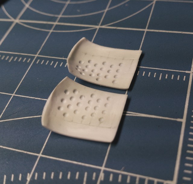 Благодарю за содействие по части предоставления ниш, но вынужден великодушно отказаться. Дело в том, что "вписать" их в существующую ситуацию вряд ли было возможным, это; перепил, смещения, углы, зазоры, несовпадению по абрису и.т.д. Поэтому мною был принят вариант сделать их с нуля по месту, ну и конечно с допустимой долей упрощений для данного масштаба. Естественно никакого видимого двигателя не должно быть. Для начала был изготовлен деревянный пуансон и по нему вытянуты из пластика перфорированные защитные экраны.