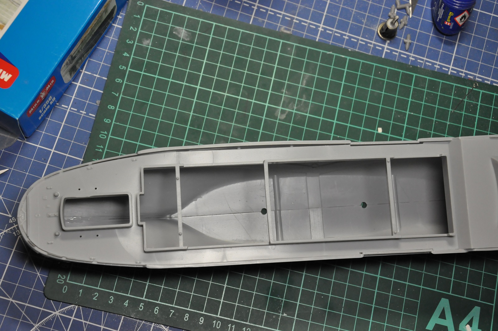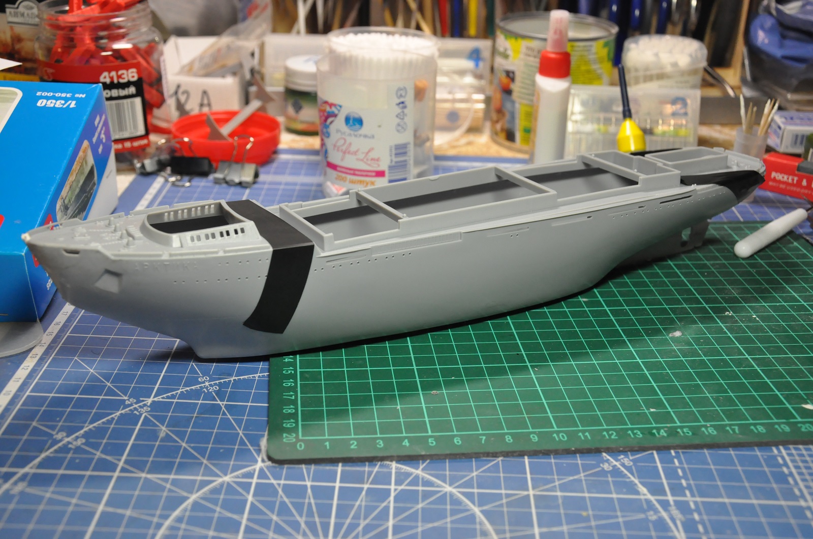 Начал сборку корпуса. Корпус состоит из 2-х половинок и палубы. Пластик при ближайшей работе с ним удивил - очень гибкий, почти как пластиковые игрушки для маленьких детей, я такого нигде не встречал. Корпуса моделей от Tamiya, AVFClub, Trumpeter, HobbyBoss, даже Звезды намного более упругие и жесткие. Склеил две половинки по обозначенным штырьками местам. Нос не сошелся, образовалась щель в 5-6 мм на носу. Пришлось стянуть половинки изолентой и так высушить. В итоге шов склейки получился очень неаккуратный, пластик с клеем вылез, придется много шпаклевать и шлифовать. При склейке палубу не вклеивал, просто вставил на свое место, чтобы половинки корпуса заняли положенное им место в пространстве.