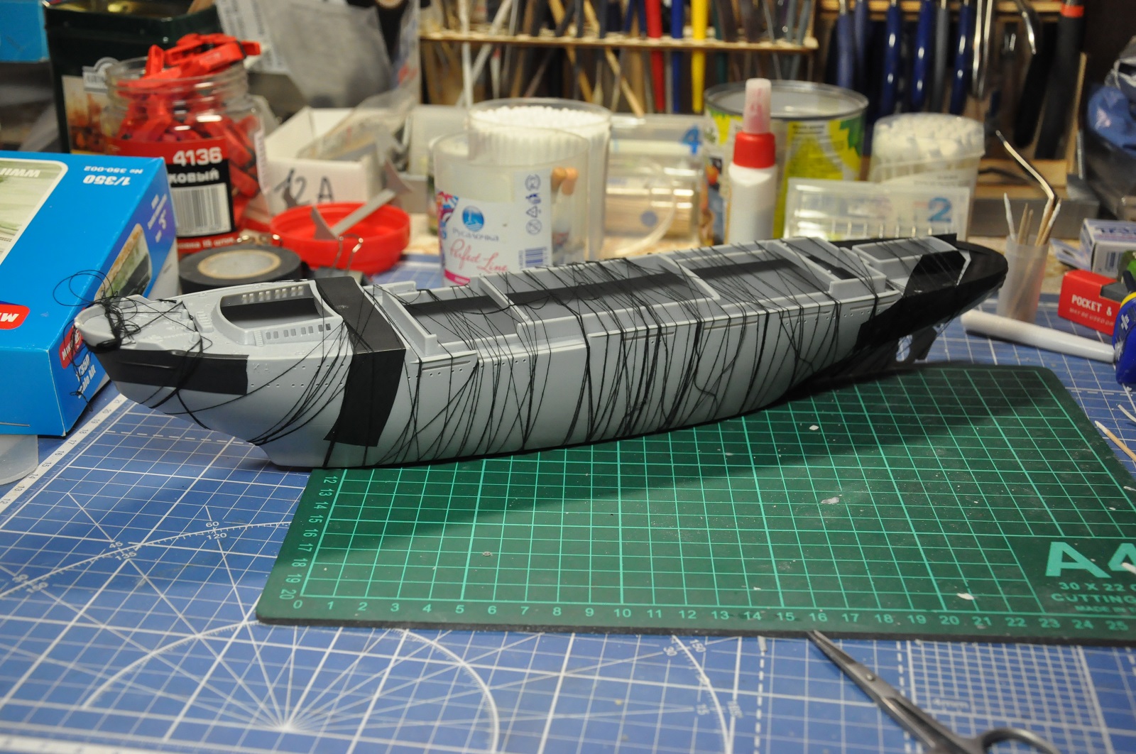 Цель этой стройки - сделать аккуратную изкаропку. Ну или может быть чуть-чуть лучше, чем изкаропку, набив руку в окраске аэрографом более крупных корпусов и площадей, чем подлодки в масштабе 1/350. До этого опыт окраски корпусов больших кораблей был не совсем удачный - я только-только начал осваивать аэрограф и, перекрашивая корпус Бисмарка, наделал манки в районе винтов. Хочется научиться красить по-человечески.