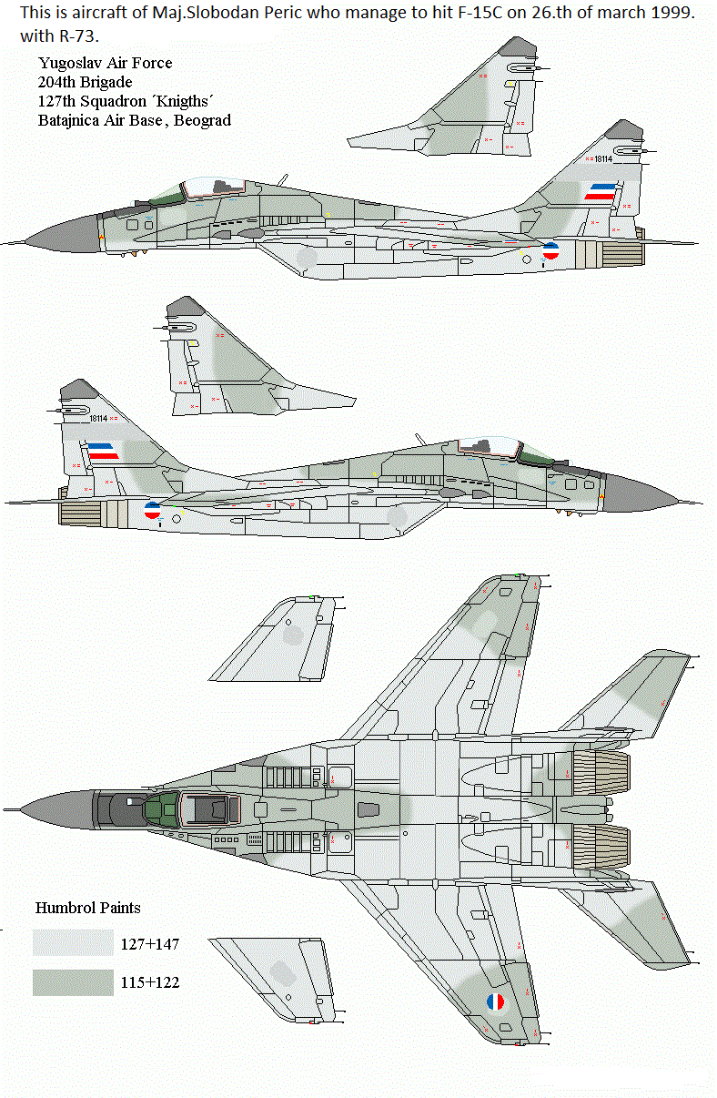 Если вам нужно что-нибудь из фотографий с наших картин ... просто скажите. Интересно, что в 1999 году наш МиГ-29 выиграл воздушный бой с F-15C от RAF Lakenheath. Вот несколько схем рисования, и у меня есть много документации об этом ... ;-) Вот ссылка на официальный официальный уровень, где НАТО и ВВС признают, что R-73 из МиГ-29 Слободана Перика. На странице 7.http://www.afahc.ro/ro/afases/2015/afases_2015/air_force/Manolache_Chis.pdf