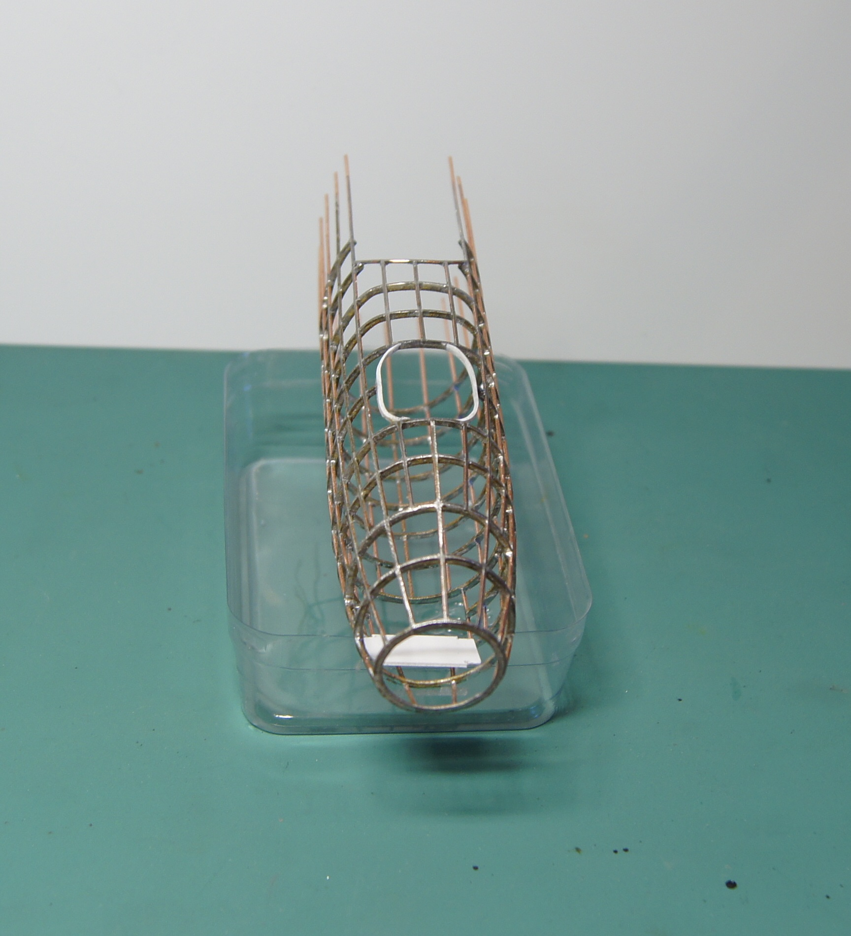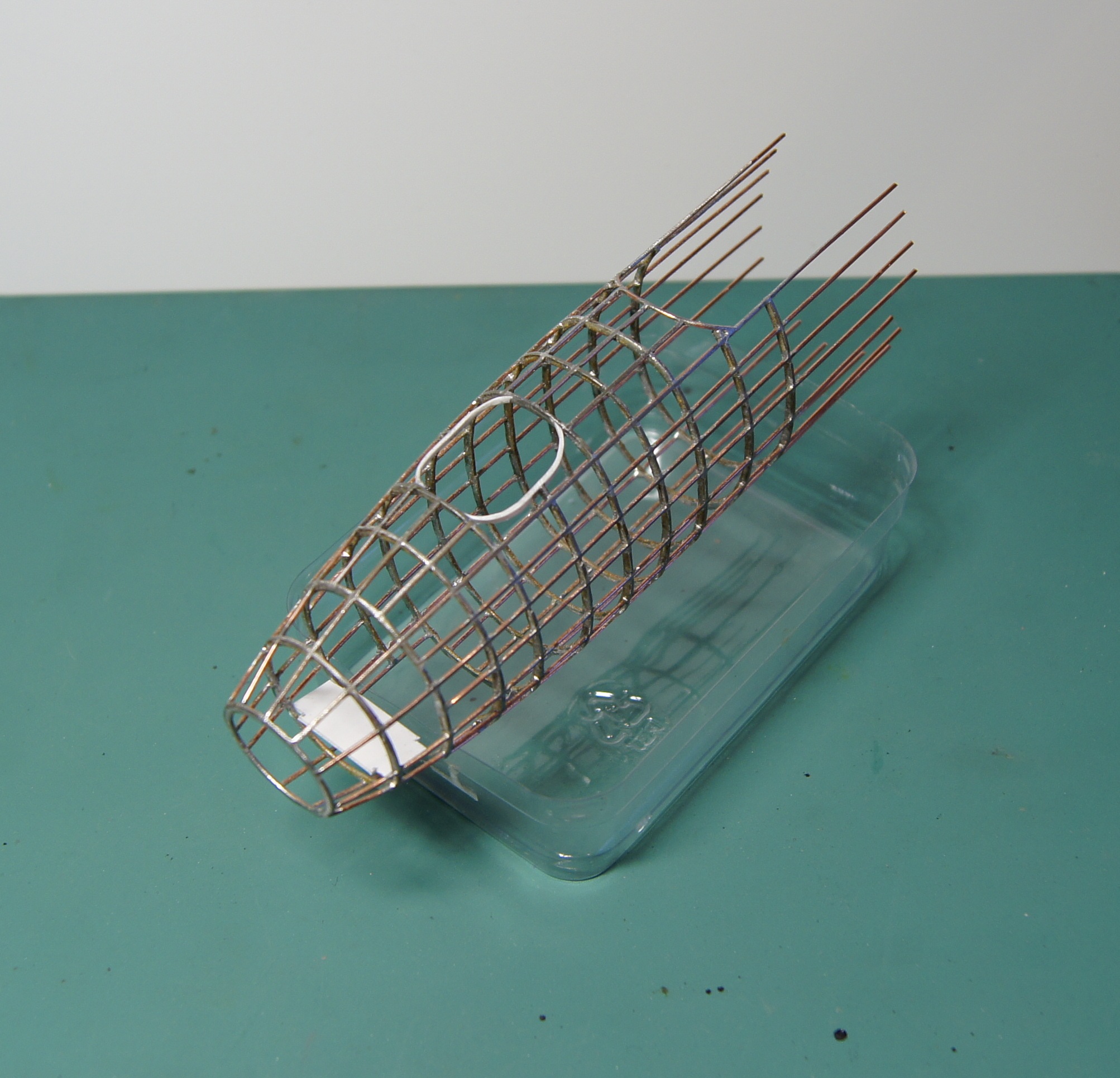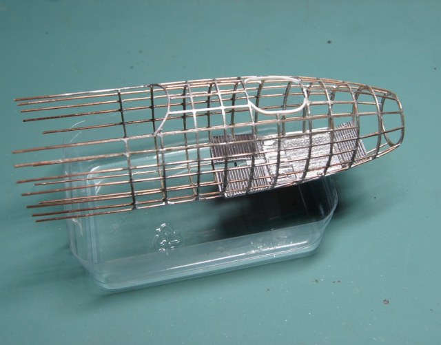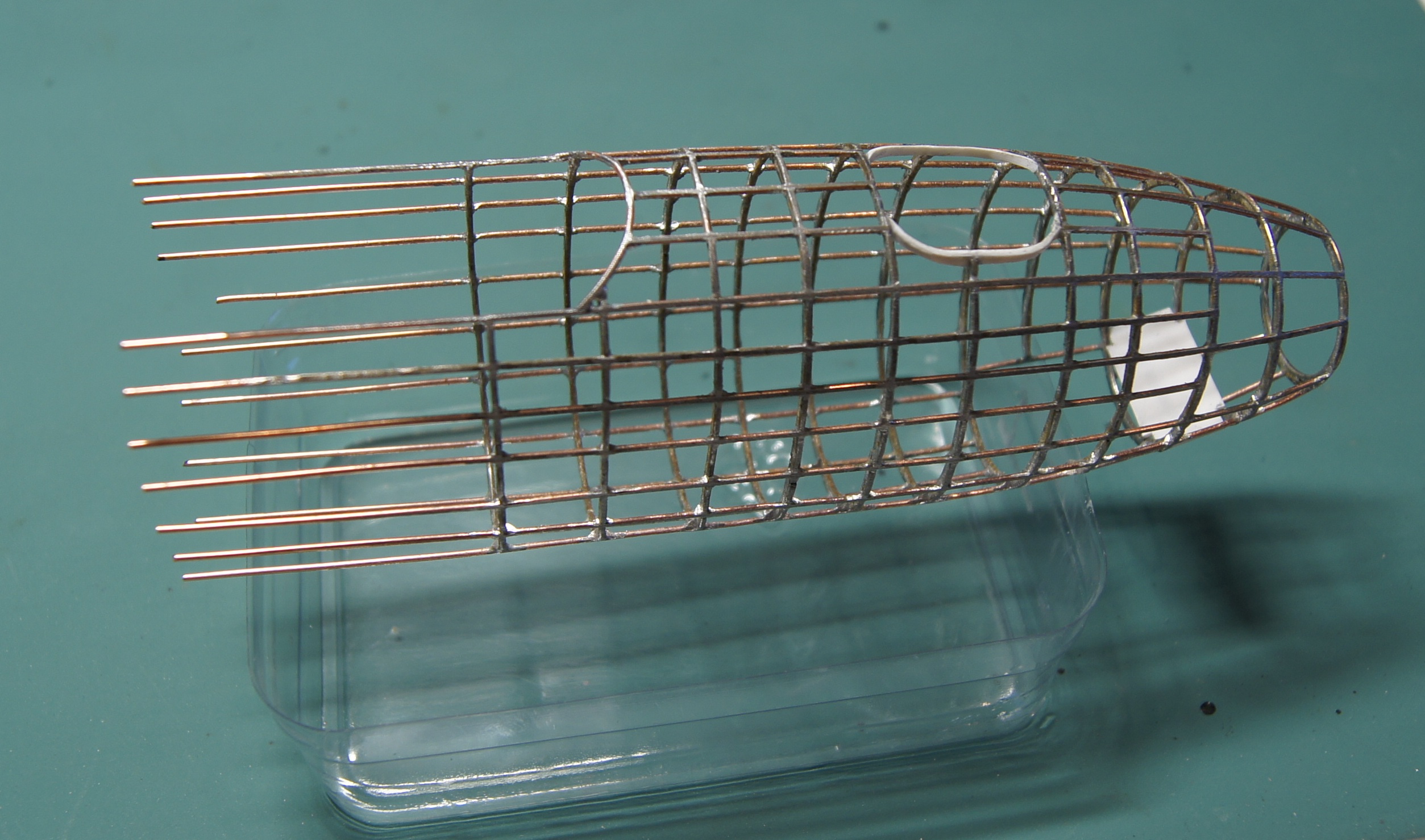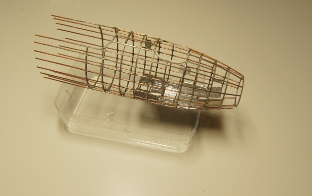 Уже есть и болванка для обтяжки пластика. А на таком шаблоне шла пайка стрингеров к шпангоутам. Каждый шпангоут - спаянная вдвое проволока. Стрингеры паялись в прорези в шпангоутах. Сами шпангоуты паялись на простых картонных шаблонах, проволока перед пайкой отжигалась, чтобы не пружинила.