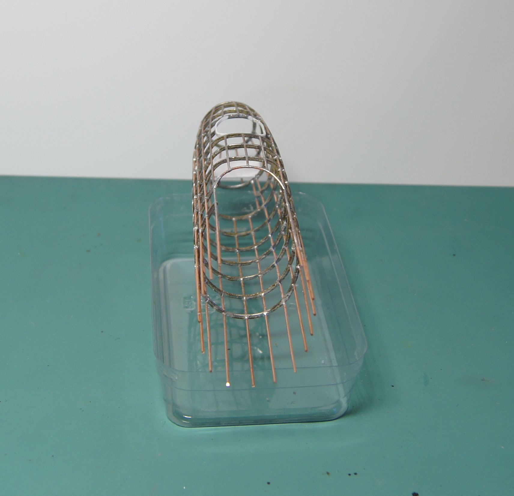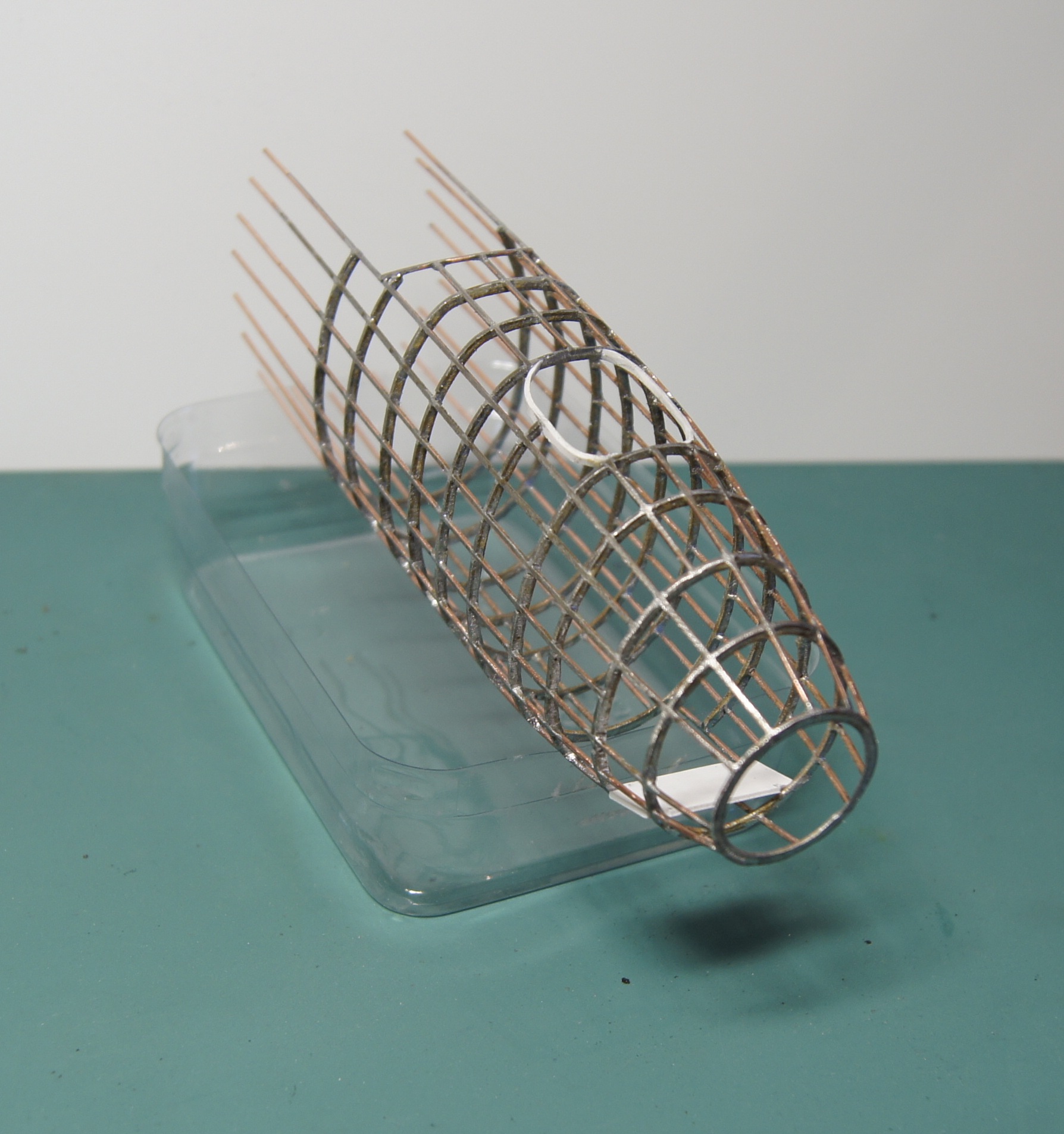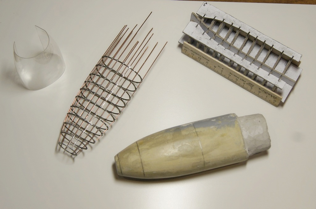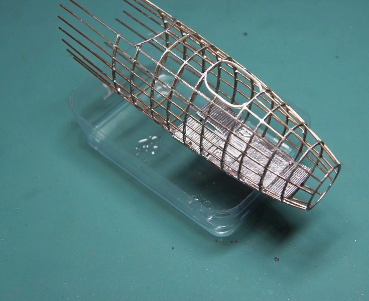 Уже есть и болванка для обтяжки пластика. А на таком шаблоне шла пайка стрингеров к шпангоутам. Каждый шпангоут - спаянная вдвое проволока. Стрингеры паялись в прорези в шпангоутах. Сами шпангоуты паялись на простых картонных шаблонах, проволока перед пайкой отжигалась, чтобы не пружинила.