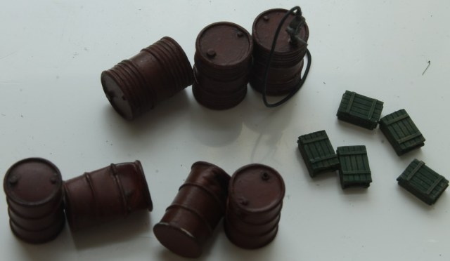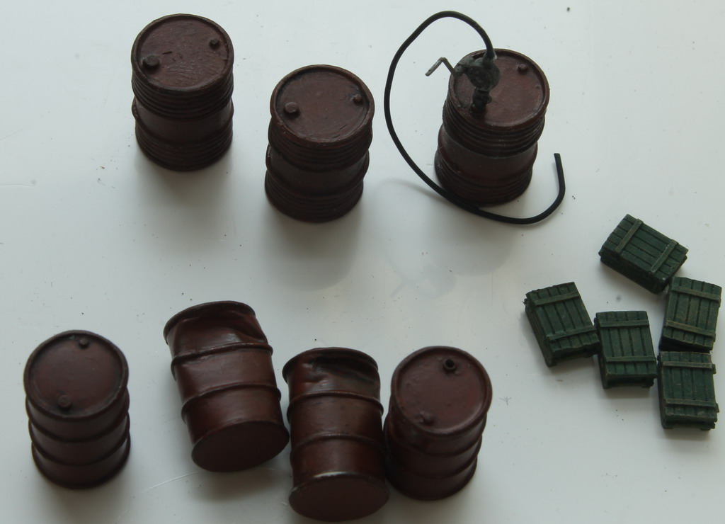 Бочки советского образца - самодельные, помпа - из набора Звезды, ведро, инструменты, колесные упоры и пр. - самодел.