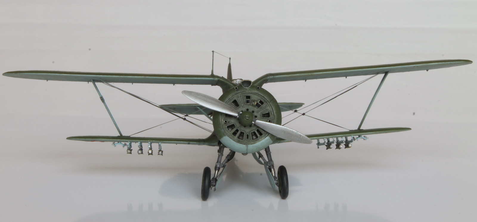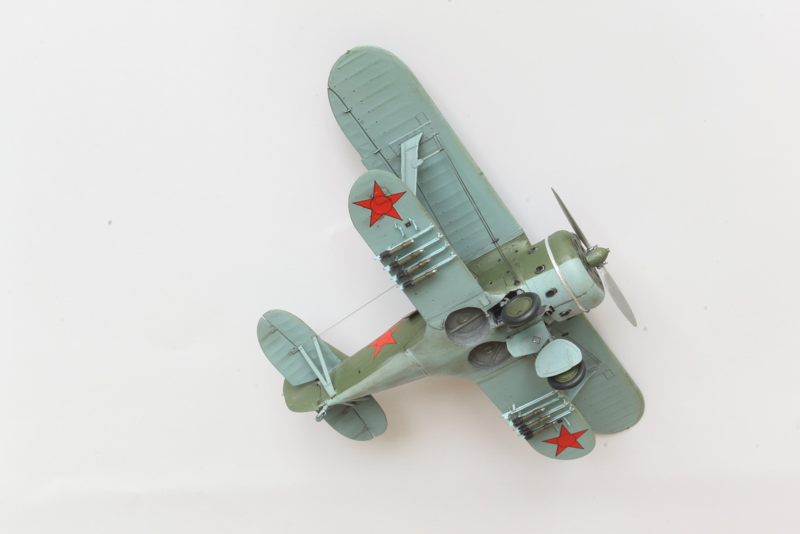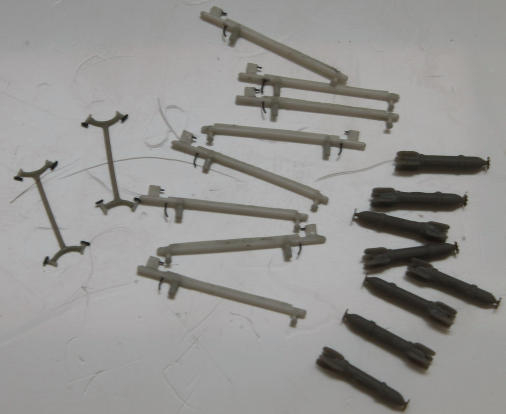 15. Срезал неверные по форме и расположению РО под крыльями, сделал самодельные. Прототип таскал еще и бомбовые пилоны, сделал и их. Одной ракеты нет - она на диораме еще не подвешена, лежит на ящике.