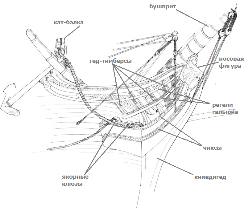 Тимберсы - верхние части шпангоутов. Огололвки некоторых из них поднимали над планширем для использования в качестве кнехтов крепления такелажа...