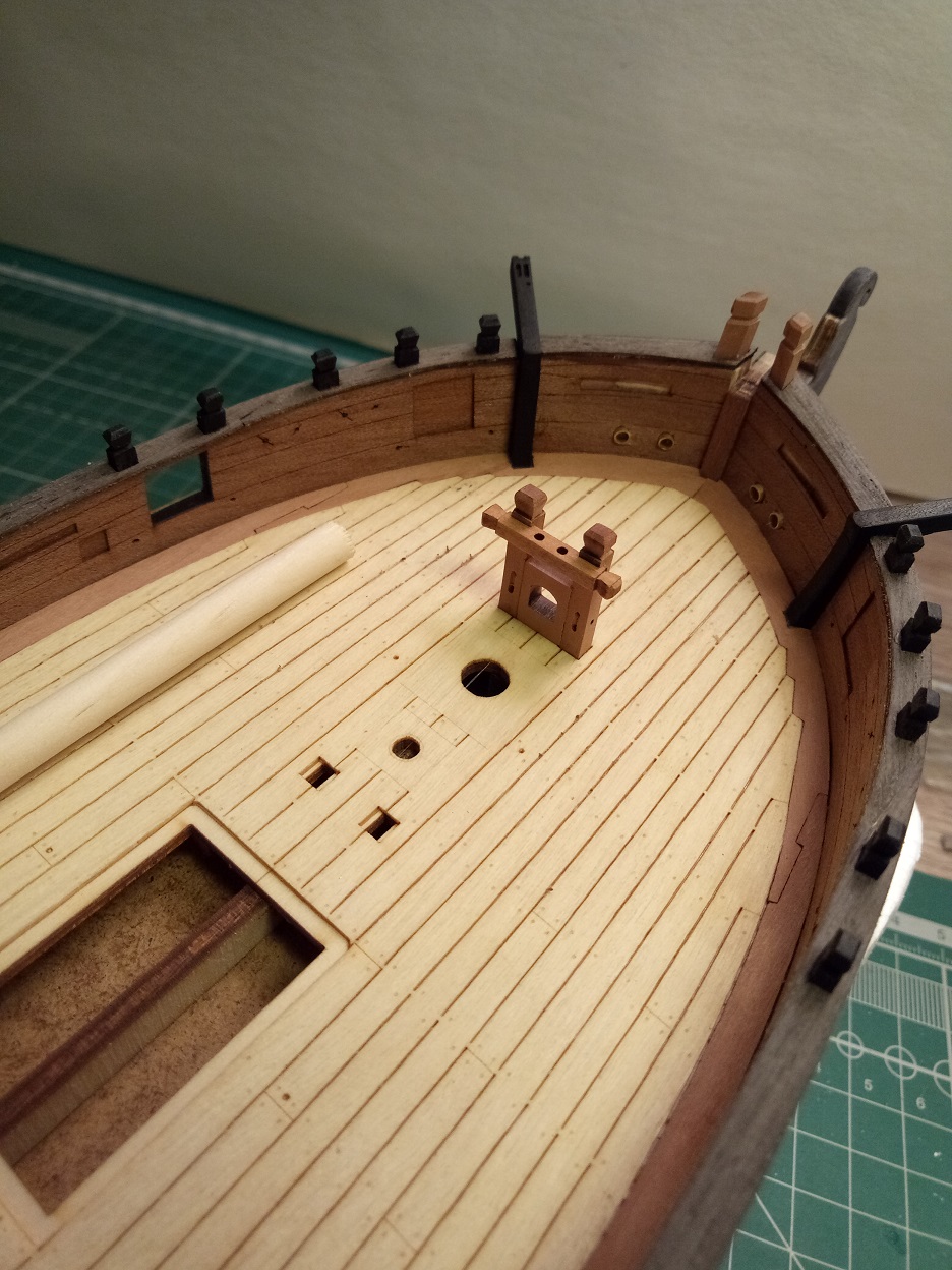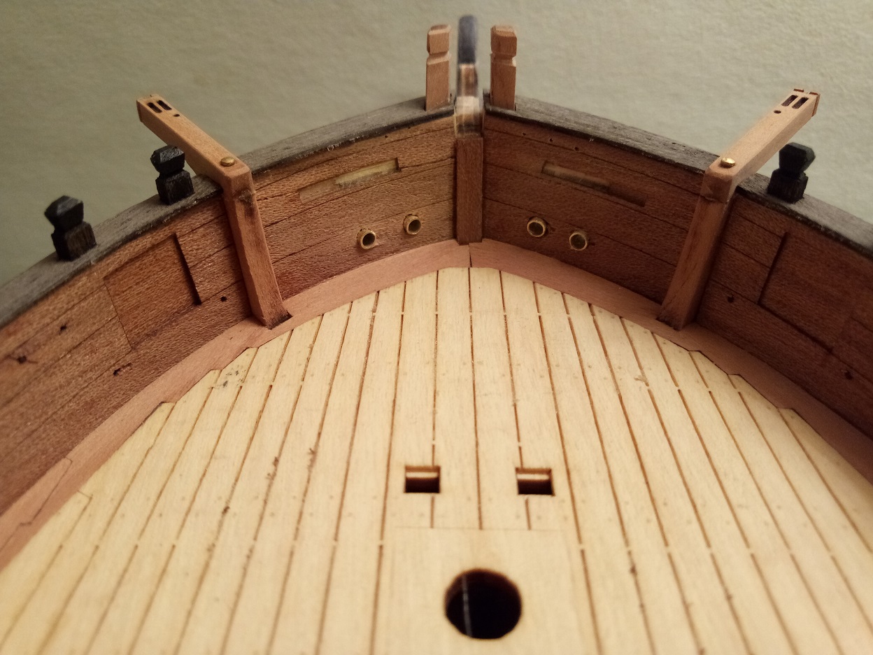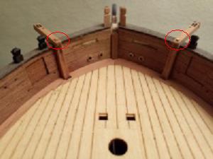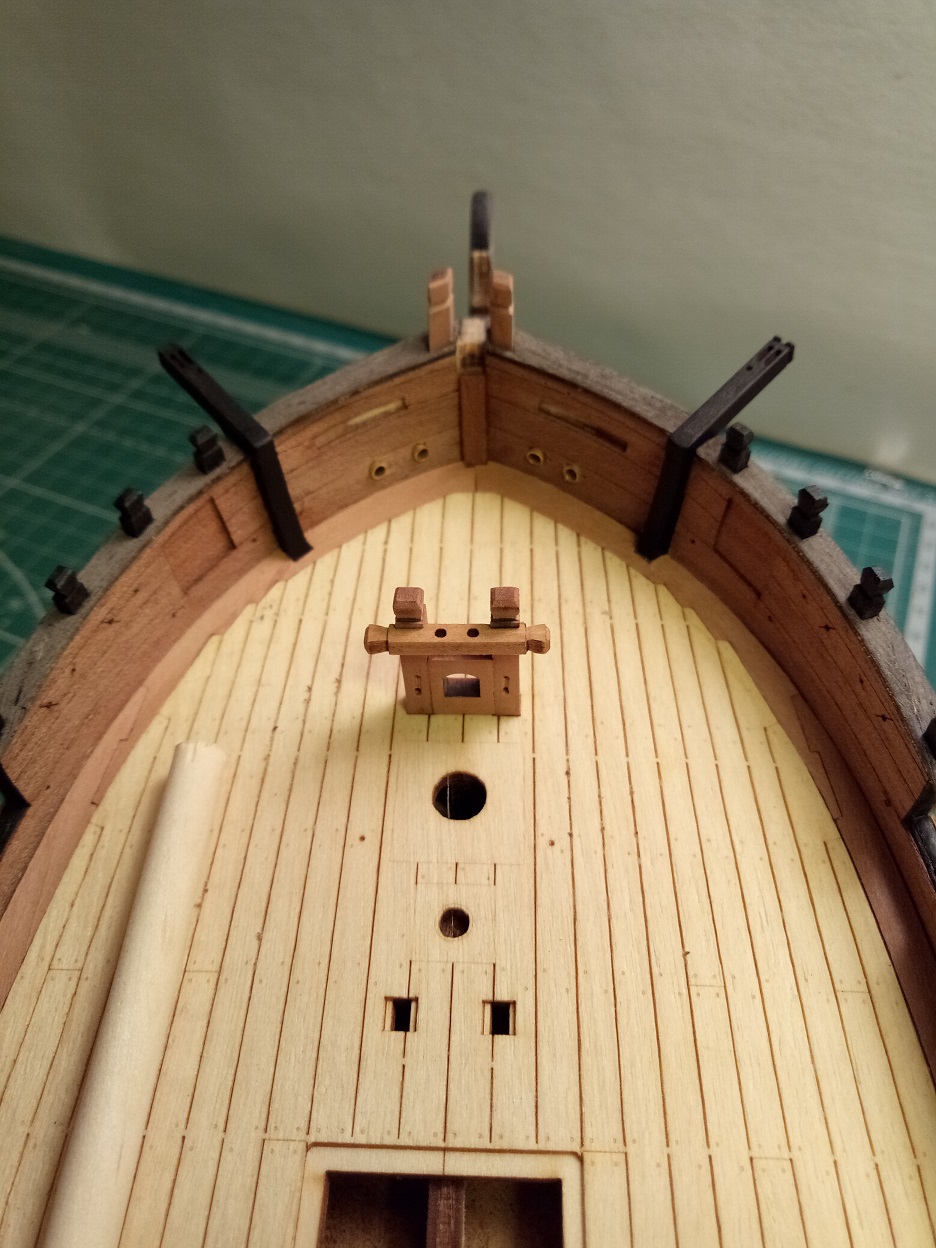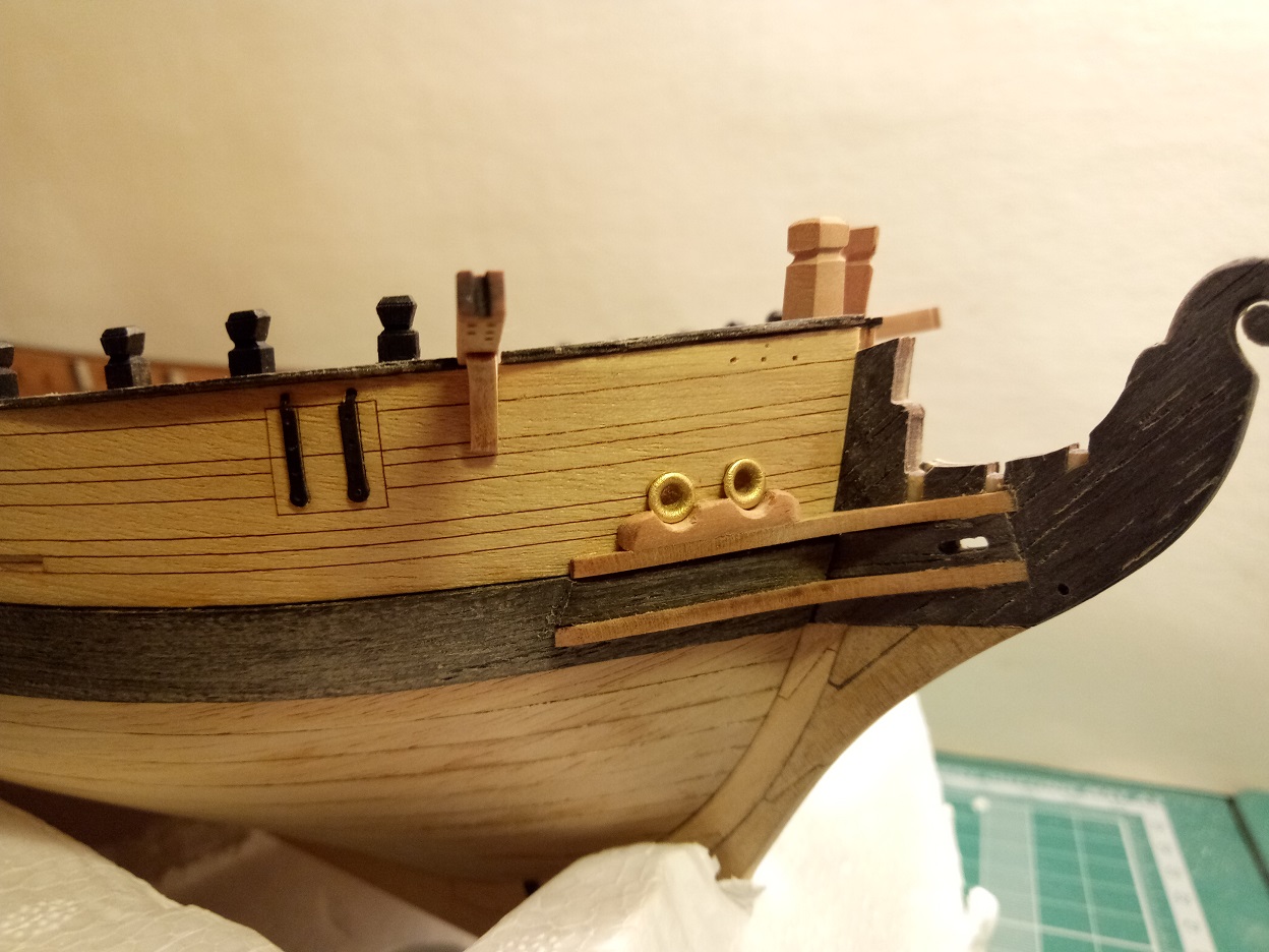 Всем привет друзья! Давненько не обновлялся. Убрал "гвоздики" с кат балок путём ошкуривания и окраски их в чёрный цвет. Так же собрал битенги бушприта, имитировал шкивы для такелажа путём сверления двух отверстий и их расточки (по типу как на кат балках). Установил шерстрек с обоих бортов.