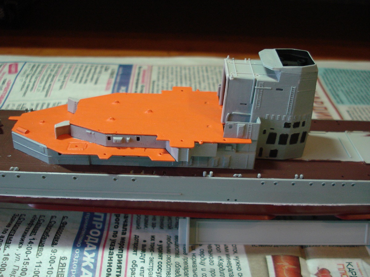 Хотел тоже делать по инструкции, но оказалась что данная надстройка в полном собранном виде никак не хочет ровно вставать в предусмотренные под нее посадочные места на палубе, получается огромнейший перекос. Поэтому решил все ставить поэтапно, сначала так