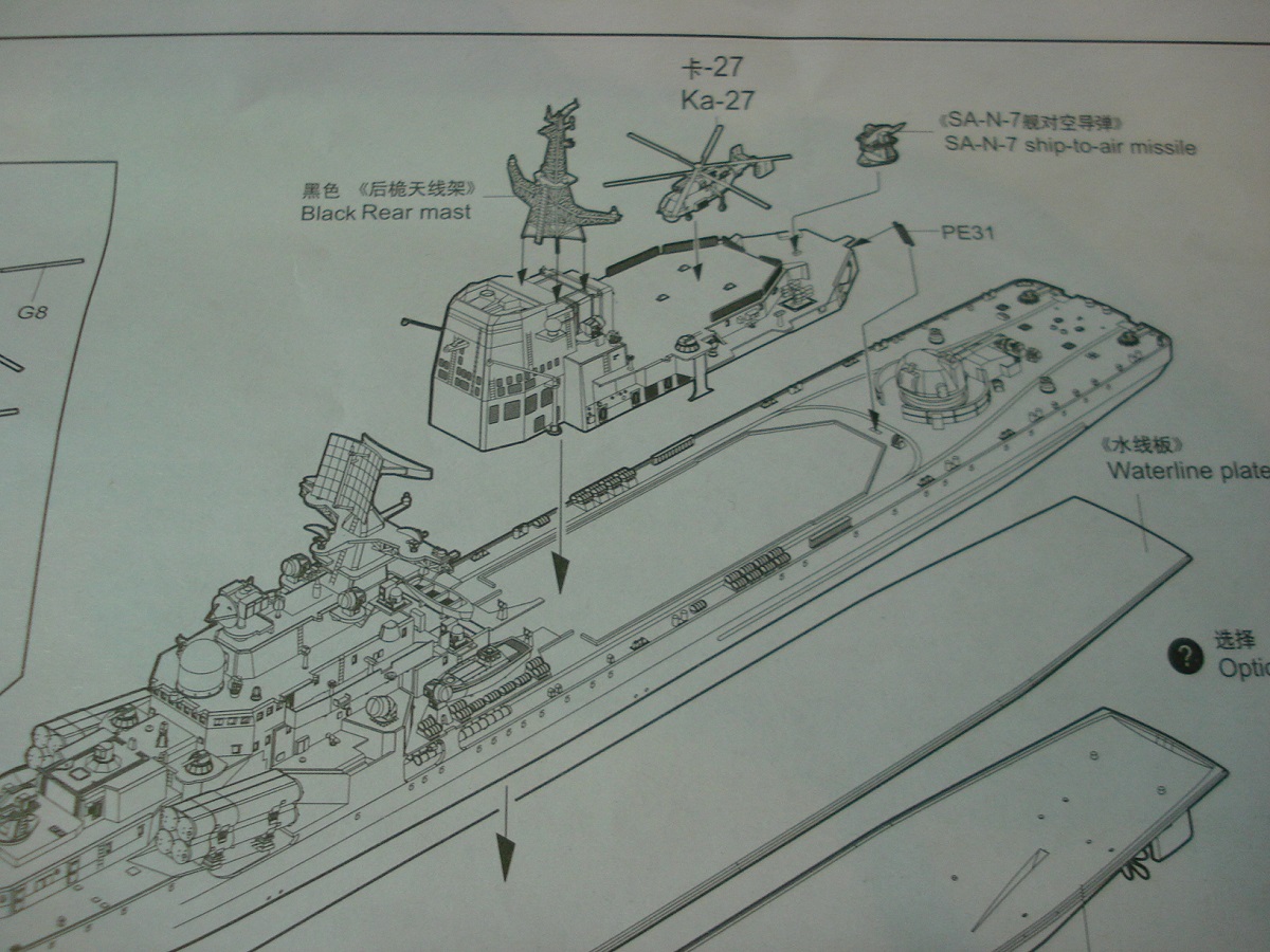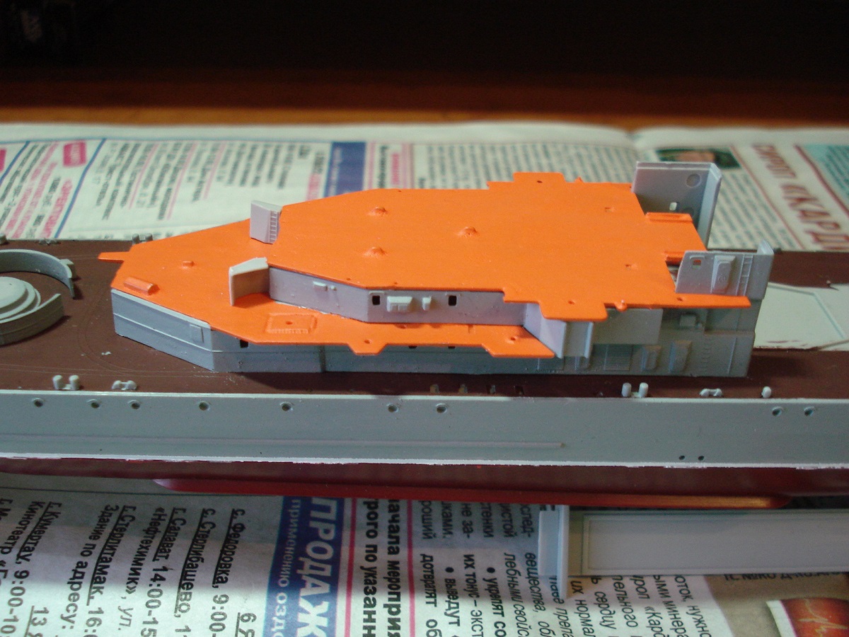 И ещё некоторые нюансы: привальные брусы появляются начиная с Боевого - кажется, это шестой корпус. Шлюпочные краны никаким местом не соединяются со Струной. 8 ПУ СППП Пк-10 появляются на последних кораблях серии. Сначала их совсем не было, позднее - по 6. Внимание к газоходам! - их надо вклеить совсем не сверху кожуха, а примерно в середину (даже чуть ниже). Стволы орудий АК-130 надо заказать у Оранж Хобби - AS03-006-28. Плоты к палубам на кораблях не клеются, а ставятся в специальные ложементы, их придется сделать самому. Бортовые успокоители качки в комплекте сильно не похожи - ищите фото в доке. Иллюминаторы прямоугольные (окна) в надстройках - можно вклеить ДО установки надстройки, но ПОСЛЕ её окраски - просто полосками оргстекла. Ну или заклеивать отдельно каждый - только это не для слабонервных, я так не делал. Ну это так, на вскидку - на самом деле там всё надо доделывать.