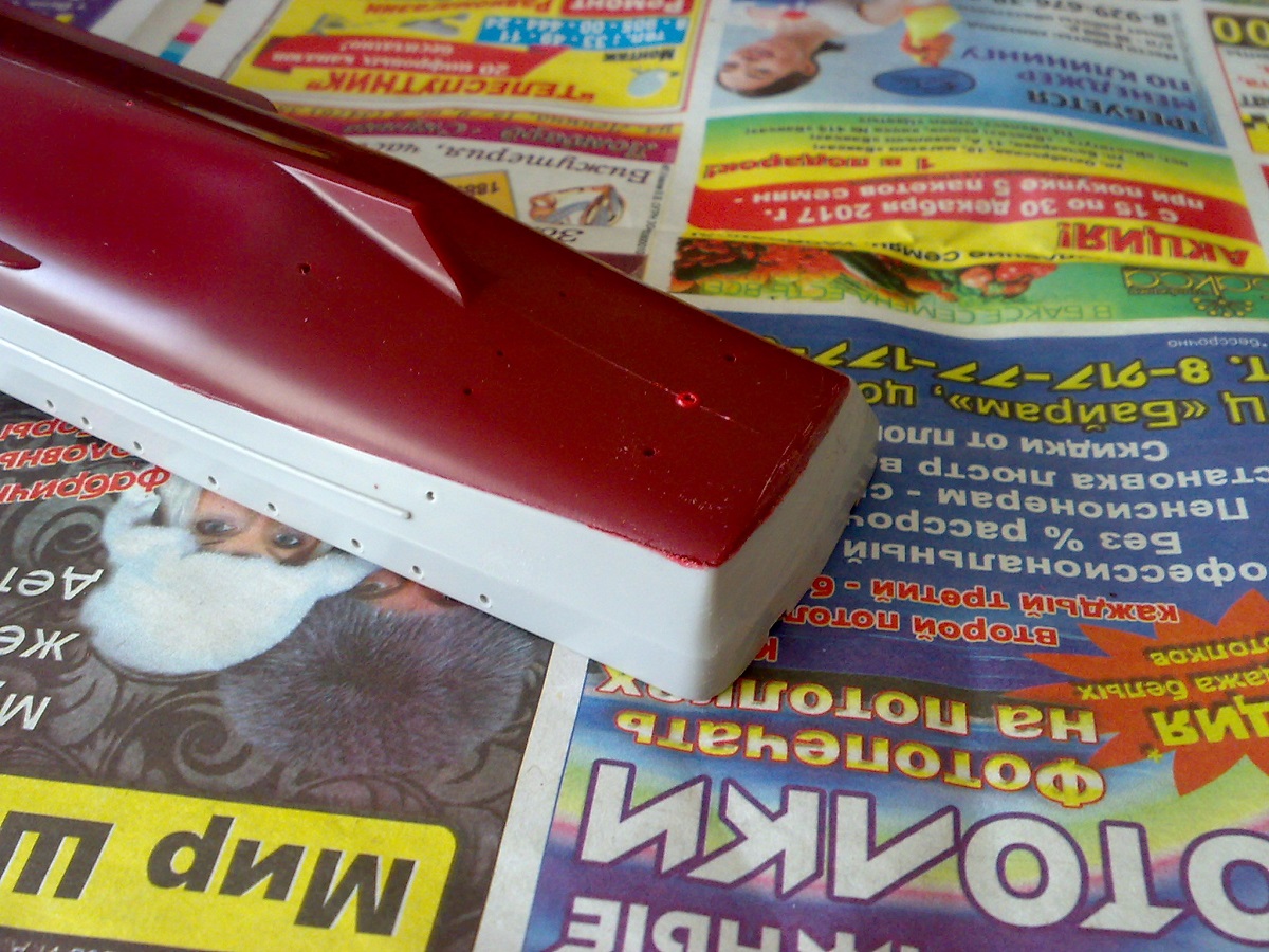 Приветствую! Начал заниматься эсминцем, предварительно попробовал состыковать верхнюю и нижнюю части корпуса. Нижняя красная часть оказалась длиннее верхней на 1, 5 мм, поэтому образуется приличная ступенька на носу или на корме. Что делать??? Сам пока думаю стачивать надфилем ступеньку на корме и потом пытаться более менее аккуратно подгонять к верхней части корпуса. Может кто еще сталкивался с этим, прошу поделиться опытом?