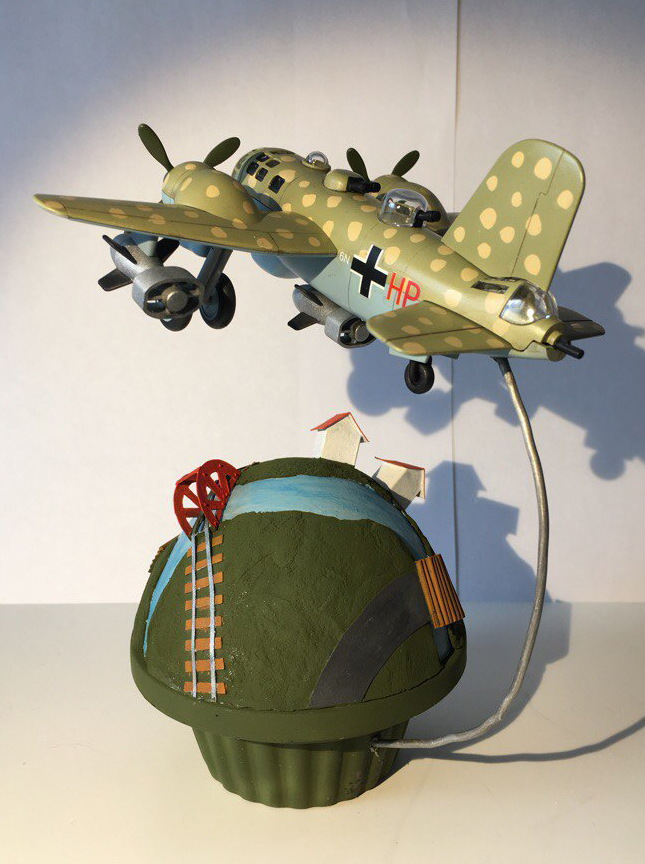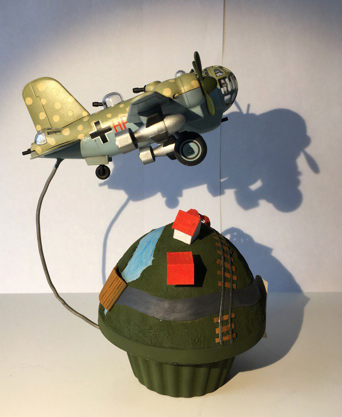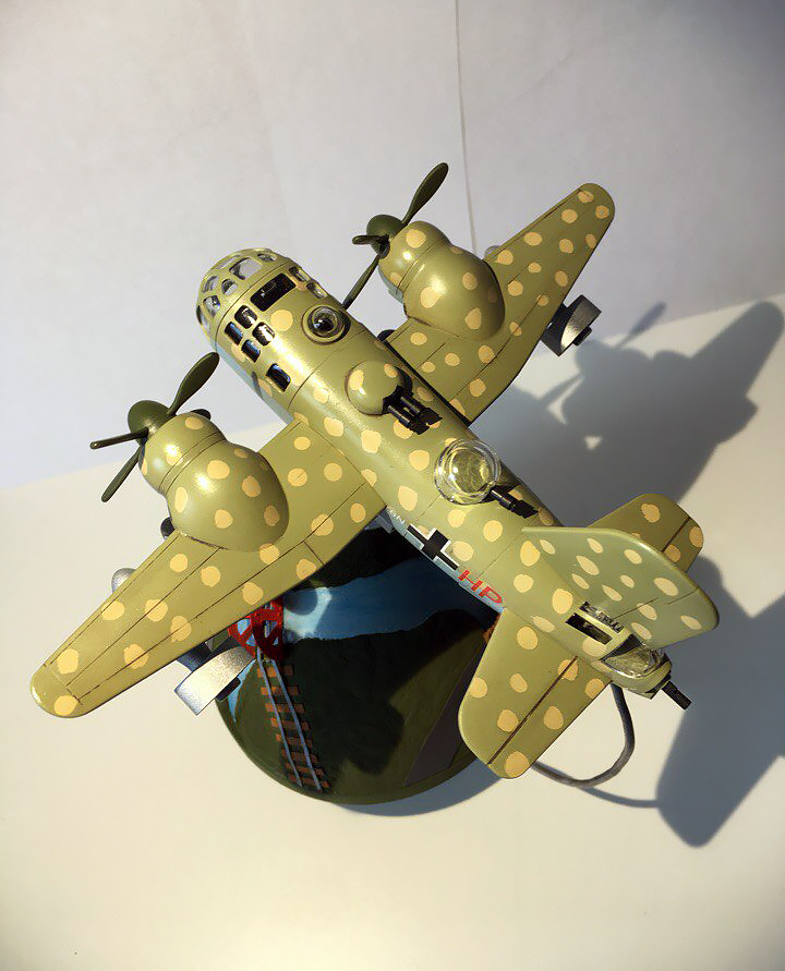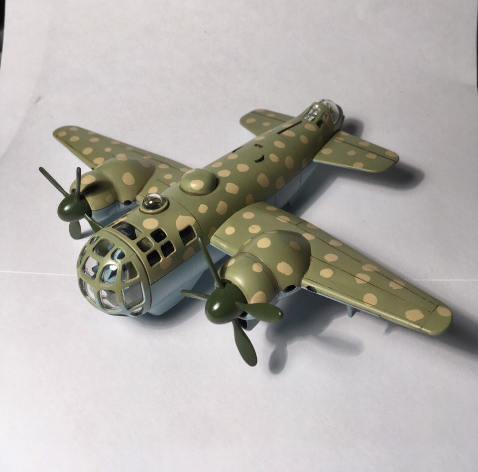 По поводу камуфляжа получилось так. Инструкция говорит красить как на картинке. Но тёмный низ мне совсем не понравился. Поэтому решили его красить голубым. А вот верхние пятна должны быть с размытыми краями, но этого сделать не удалось. Посчитав что модель детская и жёстких правил тут нет покрасили в горошек. Но нужно было светлый фон и тёмный горошек)) Что-то пошло не так)