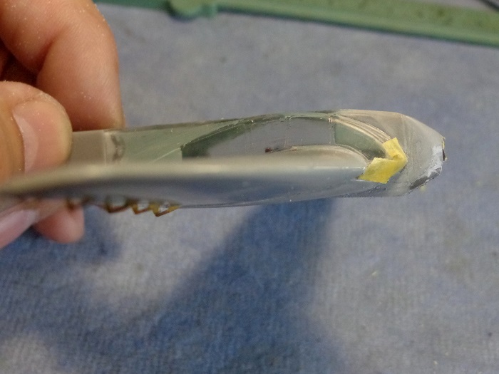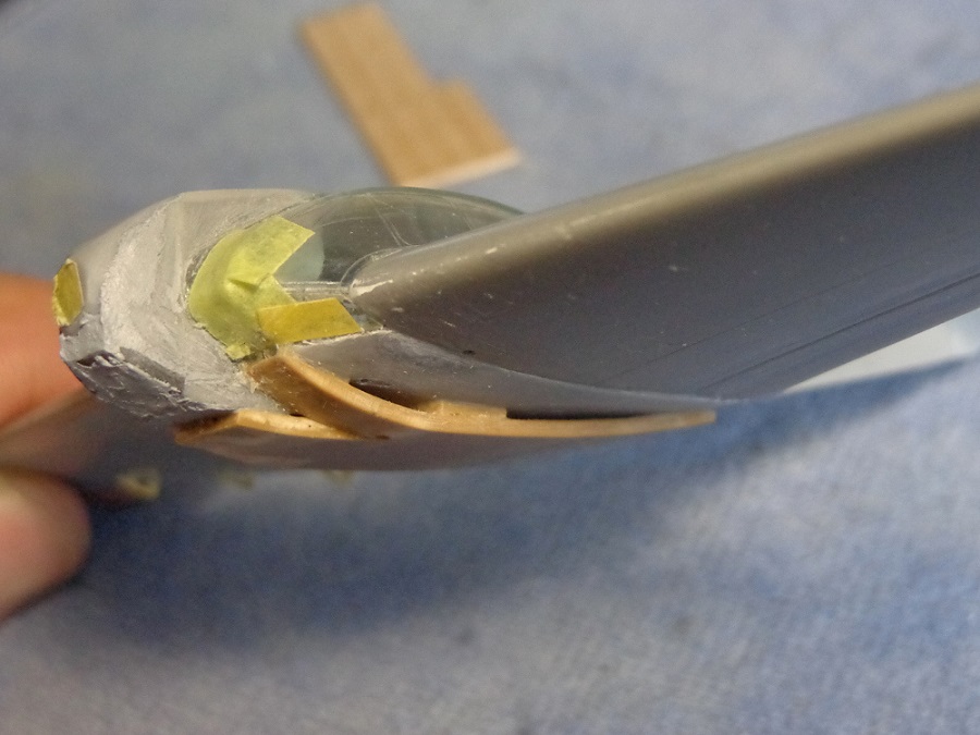 Чего делать? Выпиливать из модели эту переднюю часть остекления. И со сдвигом вниз-вперед ставить новые куски стекол. Наметил карандашом на модели новую конфигурацию "носка" фонаря.