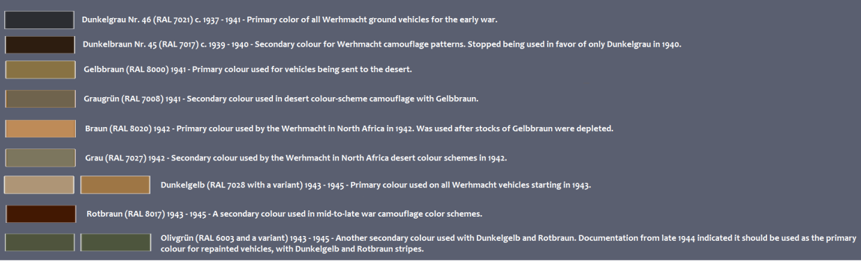 1. Вместо темно-зеленой окраски (НМ1940 номер 864) техника и оборудование войск (включая механические транспортные средства), ведущих боевые действия в Африке, должны быть окрашено матовыми (не блестящими) коричневым RAL8020 и серым RAL8027 цветами.