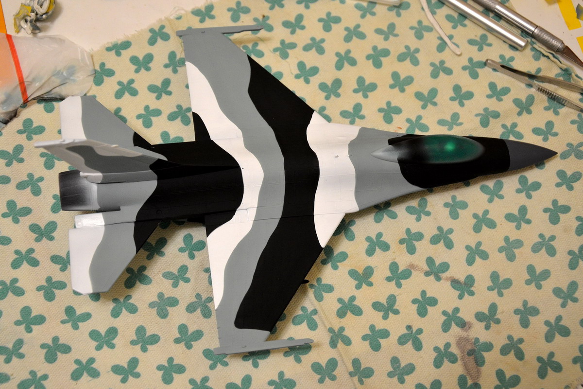Фото, как и обещал, правда качество не ахти, но картина ясна. Вот так я наносил хаки поверх дарк грина (Тамия мат). Мастика ЗИП оставляет след. Скроет ли это лак, вот в чем вопрос. Крайний случай, это обвести светлые фрагменты черным цветом, но это идёт вразрез с намеченной концепцией.