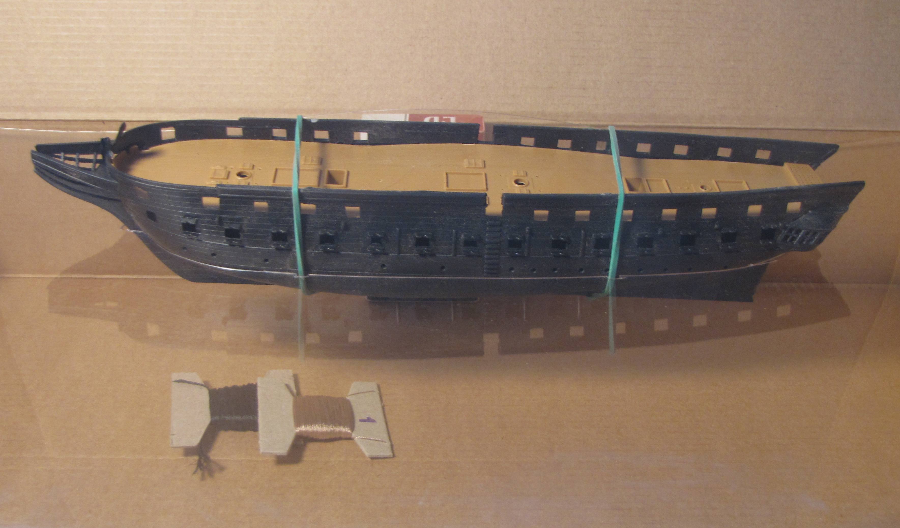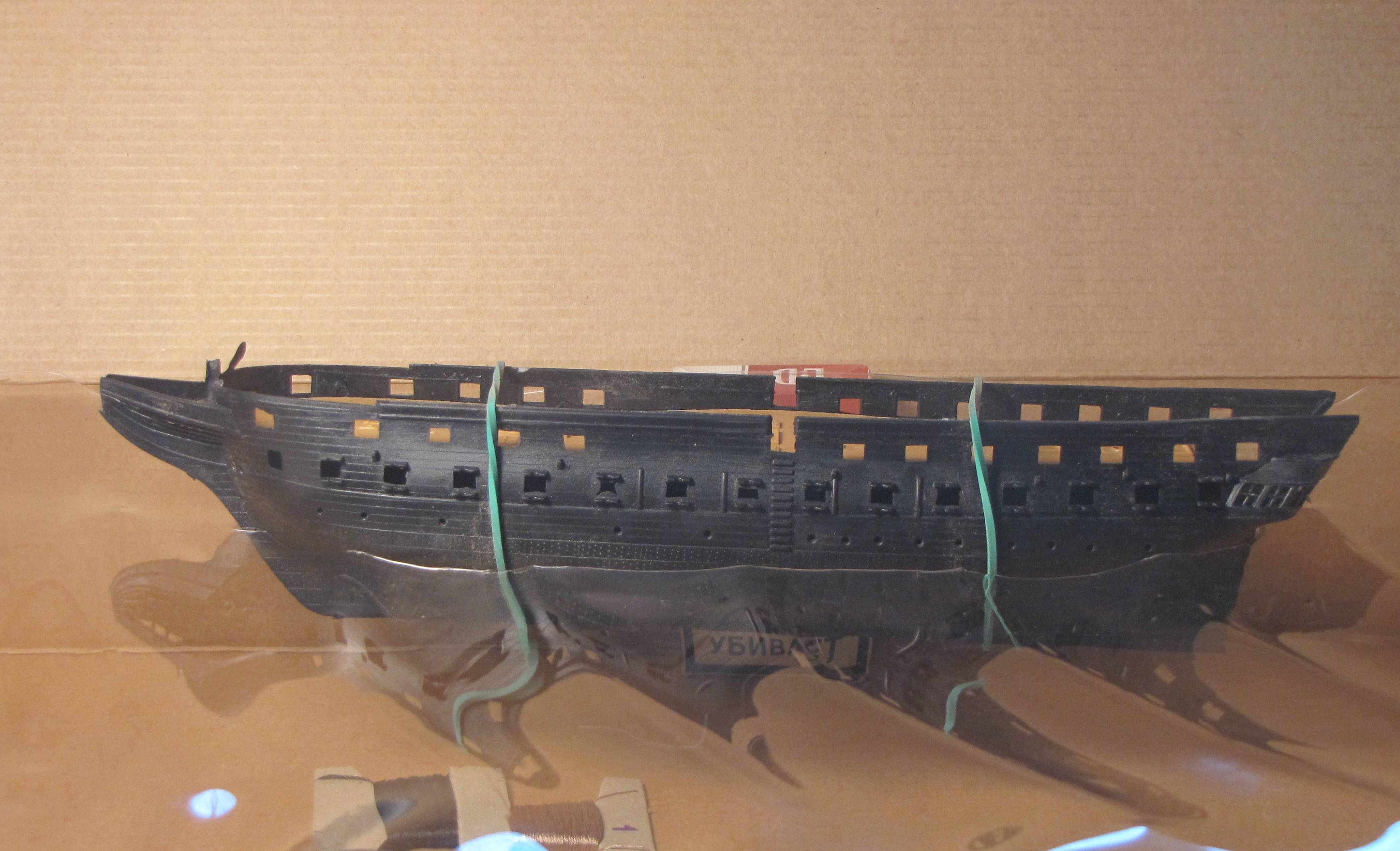 Поскольку, как упоминалось, опыта не имею, если не считать склееный и покрашенный лет 20 назад «Amerigo Vespucci» 1:700, первым делом обратил внимание на корпус. Тем более, что, как я понял, остальное всё равно придётся переделывать наверняка. Что было замечено. Корпус "Звезда", как и создатели фильма, взяла от USS Constitution. И изменила его так, чтоб лить удобней было. В результате княвдигед вышел не похожим не то что на таковой на Ахероне, но и на прототип.