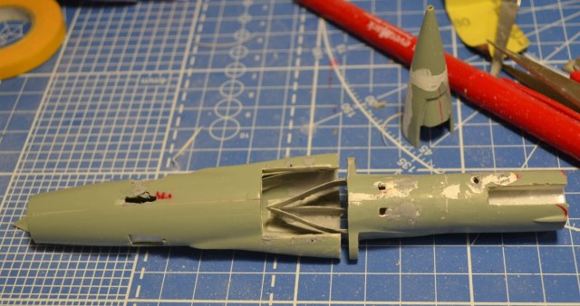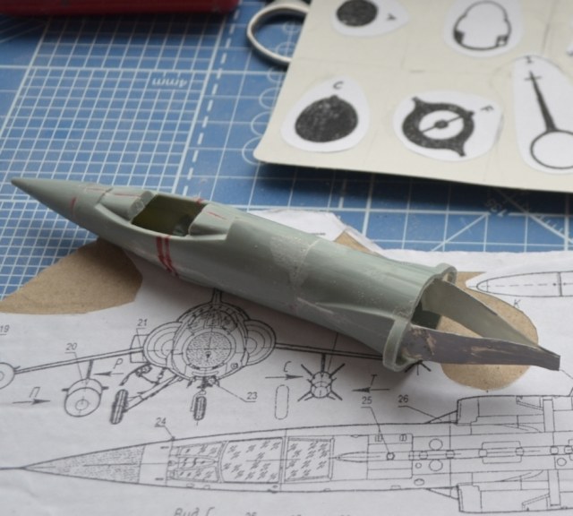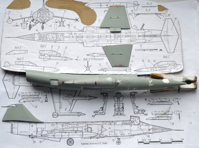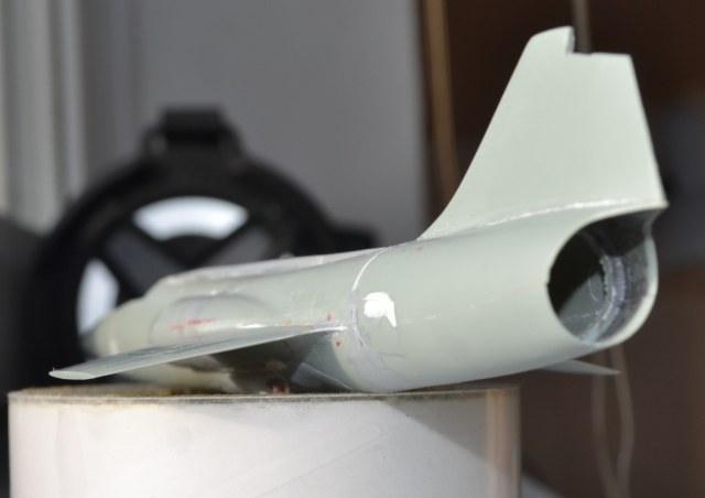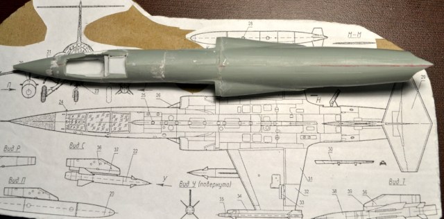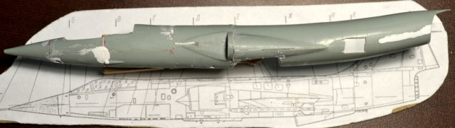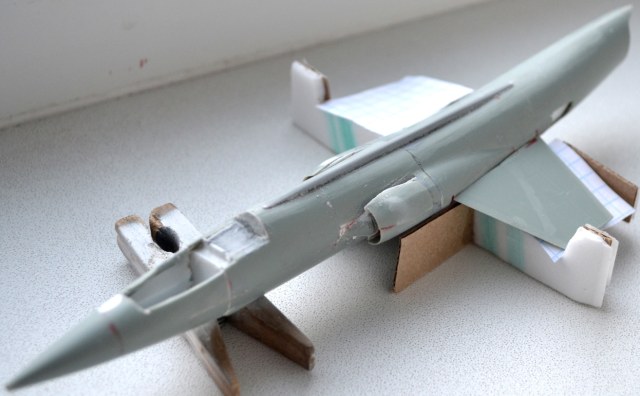 На следующий день я долго выглаживал поверхность, дабы скрыть ступеньки-переходы, однако всё-таки нашлась роковая несимметричность (корма ушла влево на градус, клей растворил закладной полистирол), в результате я опять разделил фюзеляж. Но были и достижения – подогнал размеры конусов и воздухозаборников.