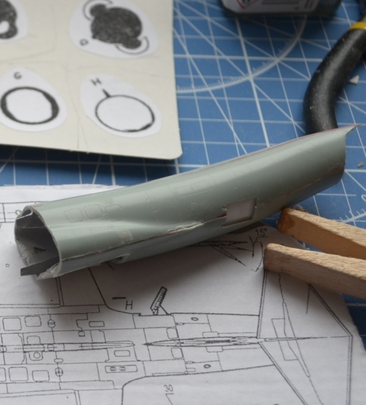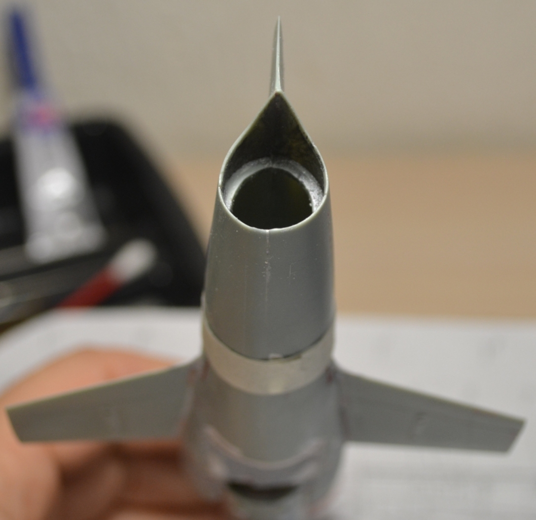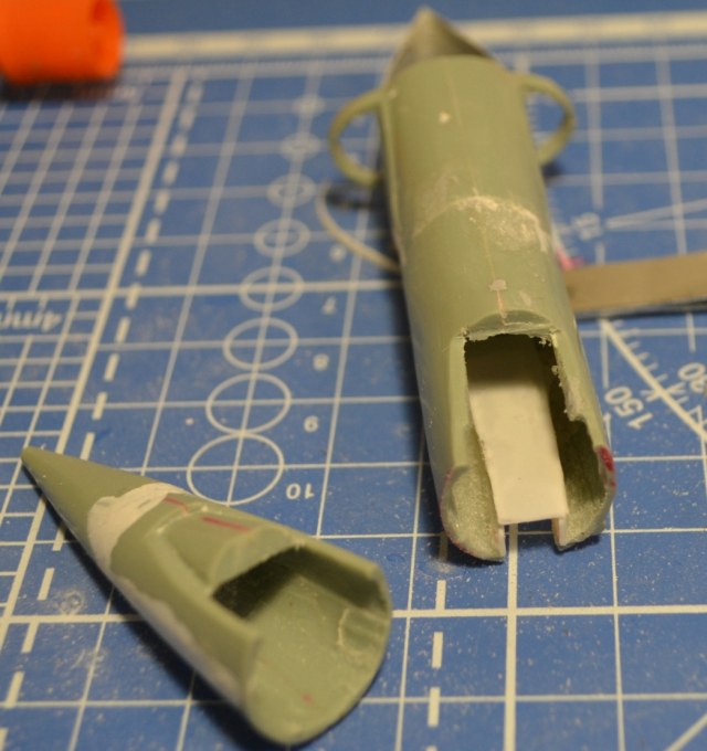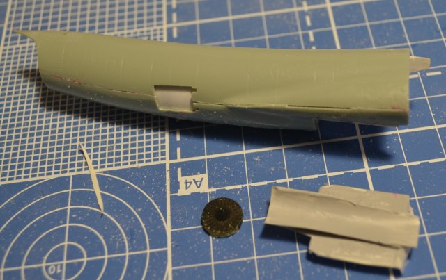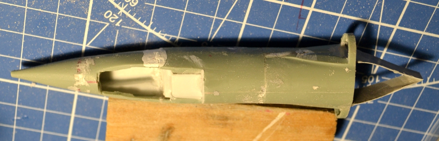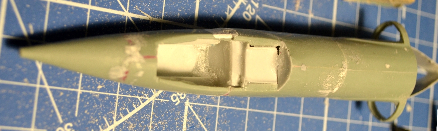 Метод продольного подгона распиленных вдоль («кусков батона колбасы») по горизонтали сложнее – приходилось ориентироваться на разрезы из М-К, благо старался совмещать с теми, что в журнале. Собственно, к концу декабря были готовы по своим сечениям: обтекатель РЛС, передняя часть фюзеляжа, отсек «Ф-3» (это который с воздухозаборниками и конусами – их я кстати срезал), ну и корма. Забавная деталь – так как кит переразмерен, то и сопло двигателя слишком большое, но я нашёл выход, используя сопло от Италовского Фантома F-4G в качестве шаблона, ведь на них стояли одинаковые двигатели – GE J-79.