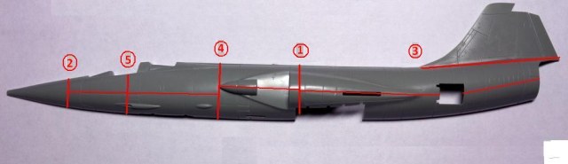 Сначала поделил каждую сторону пополам – по переднему краю выреза отсека шасси (разрез №1), отпилил обтекатель РЛС у каждой стороны (№2) и склеил его половинки, положив туда три дробинки по 1 гр. После срезал киль (№3), благо он только с одной стороны, затем был разрез №4. Отложив ножовку, взялся за "поперечное" стачивание - прикладывал каждую секцию к ровной поверхности и проводил по краю линию линию миллиметровым маркером, затем стачивал на 400-й шкурке каждый отсек, после чего склеивал левую и правую половинки. Каждую секцию резал вдоль по горизонтали - как на схеме, и повторял процедуру с маркером и шкуркой, пока не попадал в требуемое сечение.