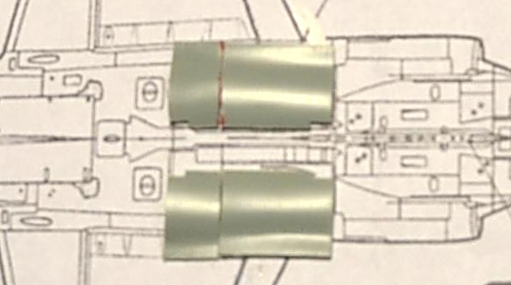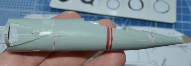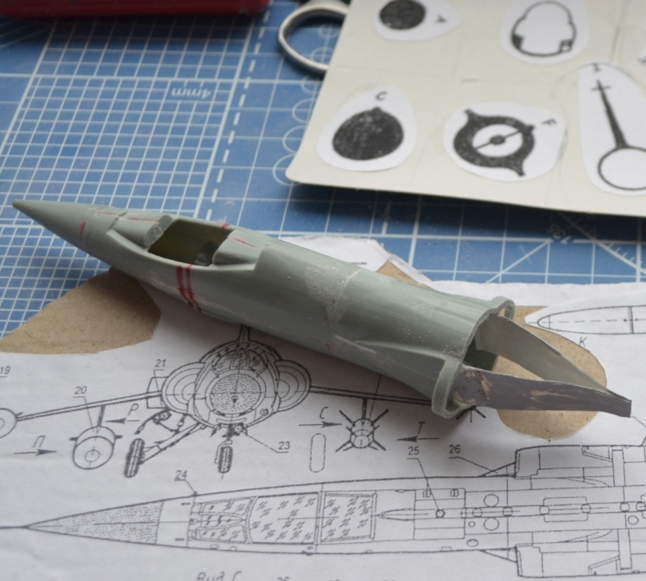 Как и на чертежах, сохранился небольшой наклон оси двигателя по отношению к продольной оси самолёта, но не такой критический, какой был в оригинале. Для компенсации наклона заложил полоски полистирола средней толщины на верхнюю половину, подточил их "на конус" внизу и успешно склеил, совместив продольные маркерные красные полоски.