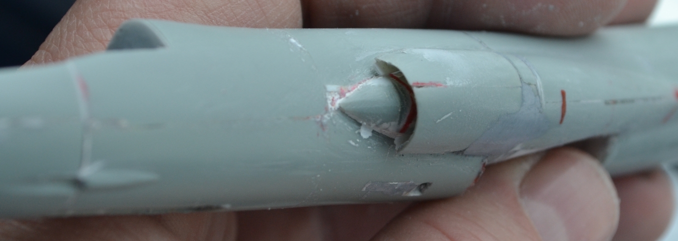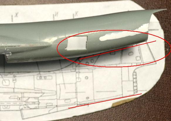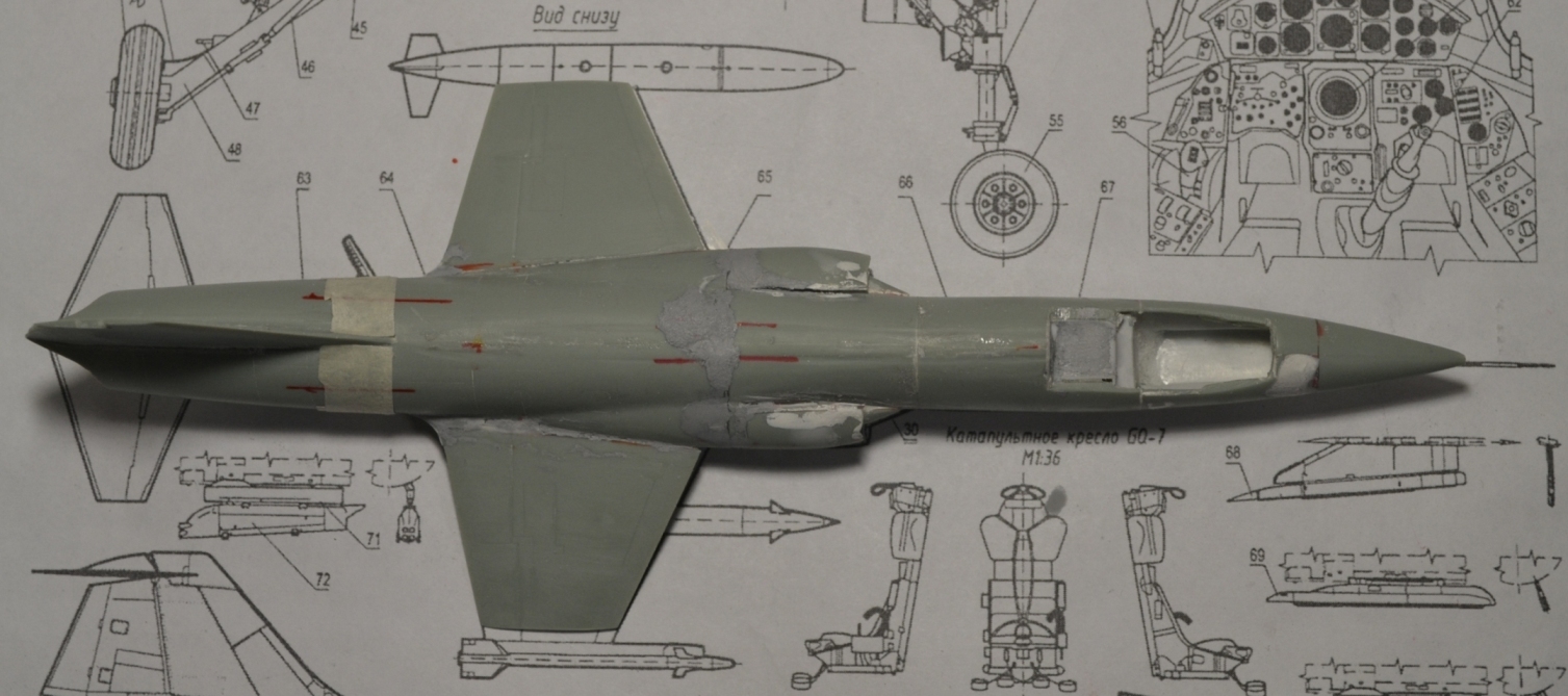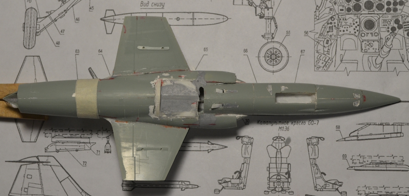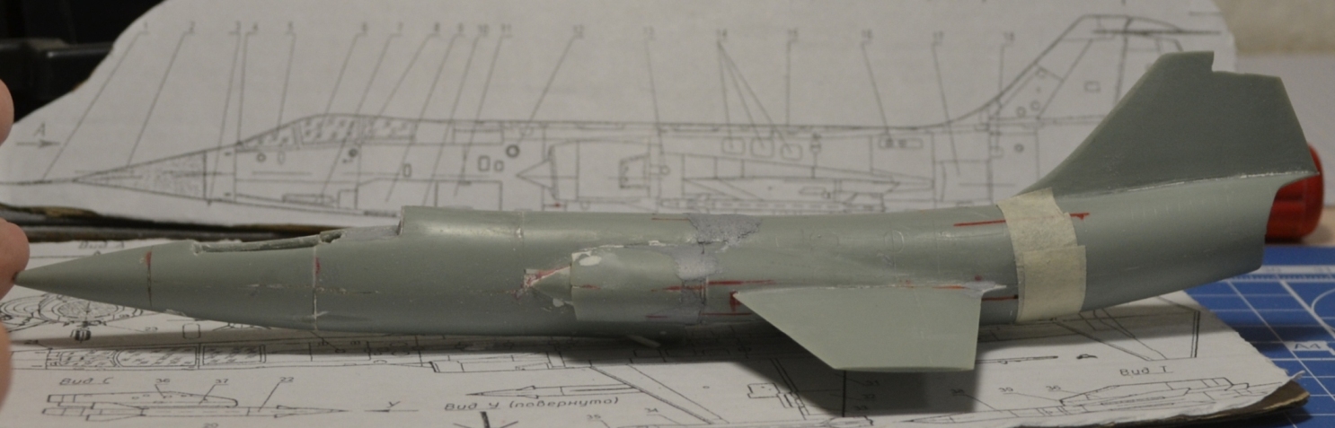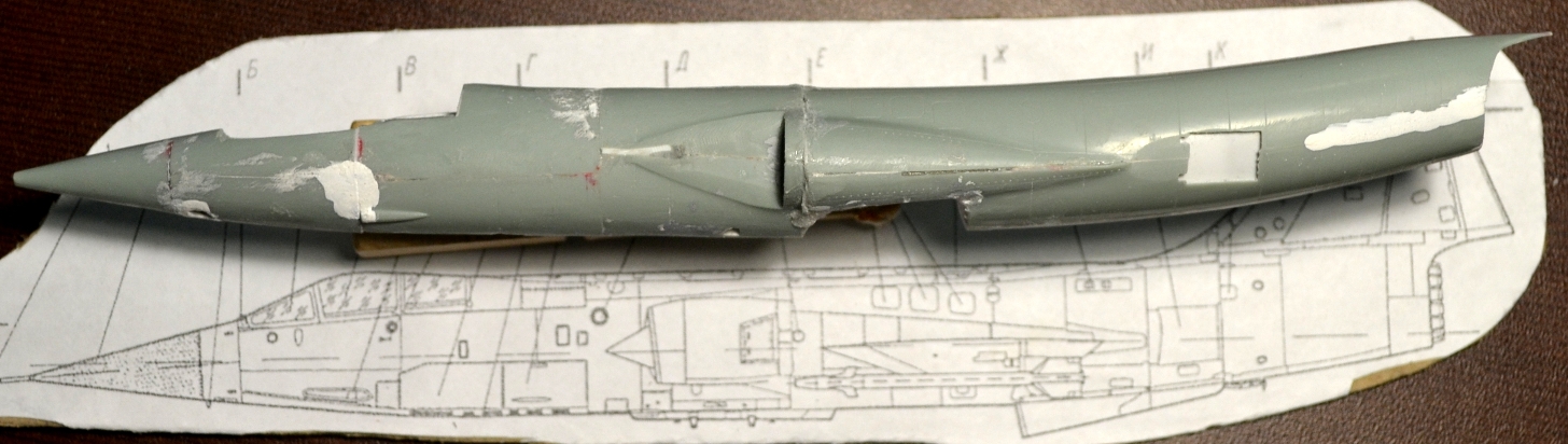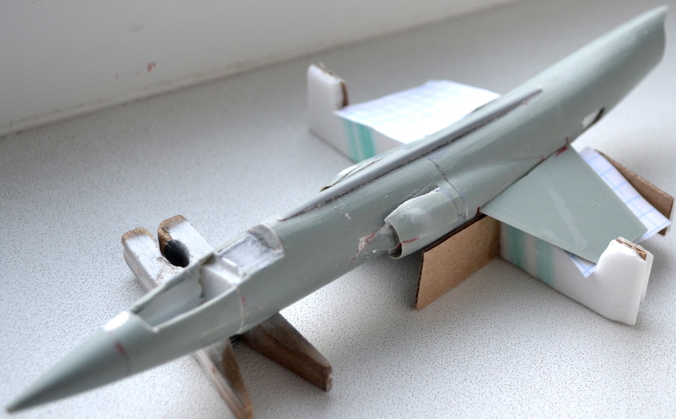 4. После приклеивания воздухозаборников пришлось гладить поверхность сверху и замазывать снизу, т.к. после укорачивания отсеков фюзеляжа пошли ступеньки, а совмещал-то половинки я по верхнему контуру фюзеляжа.