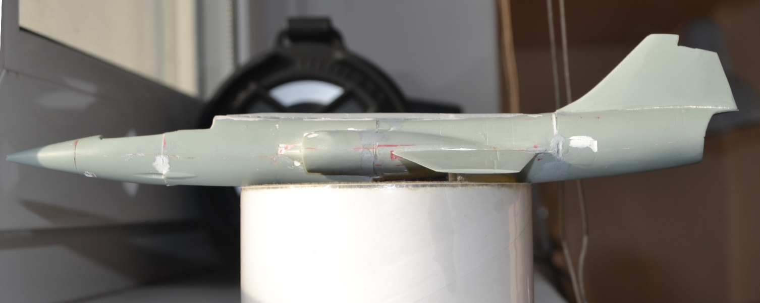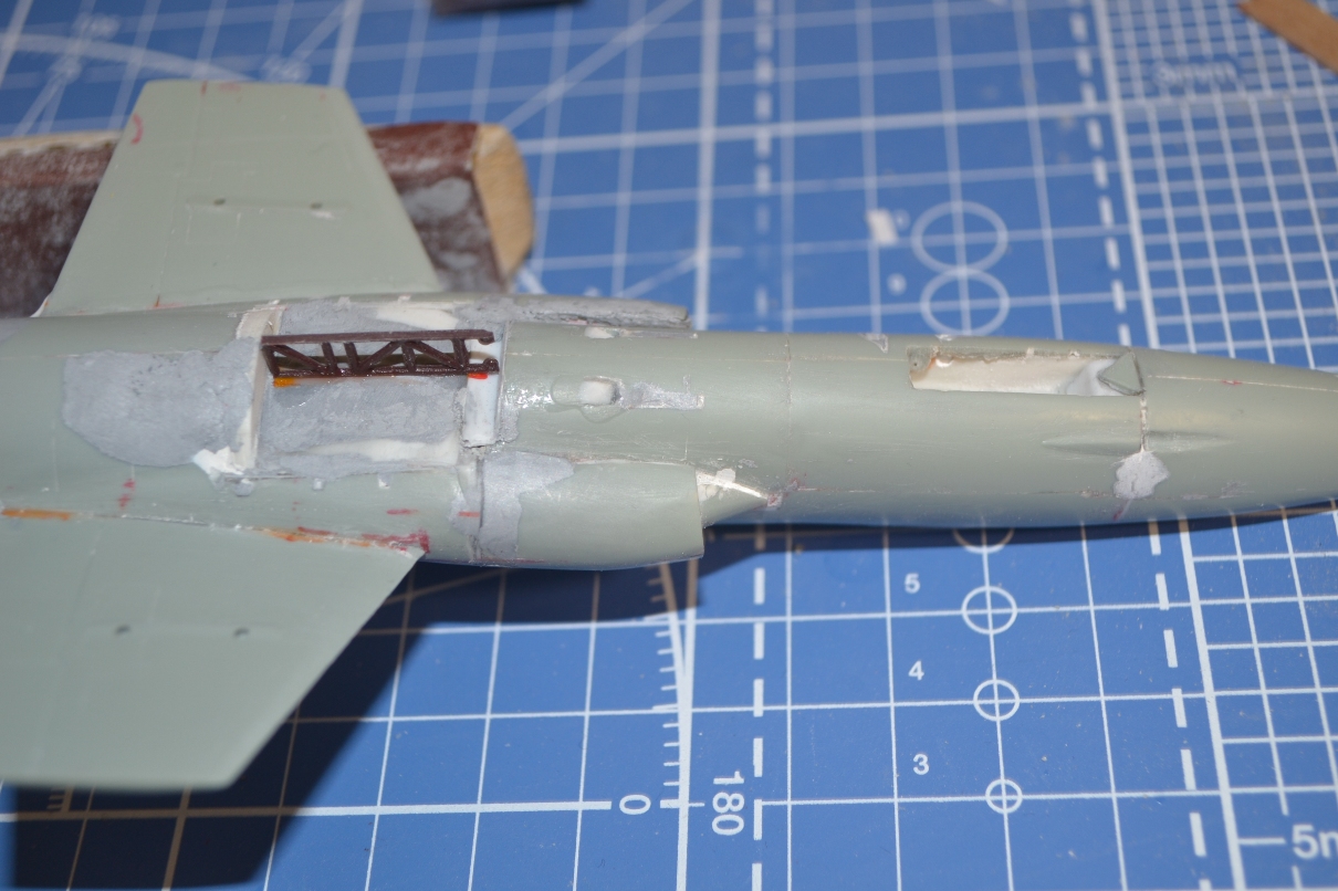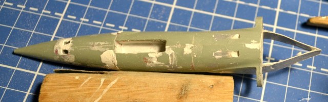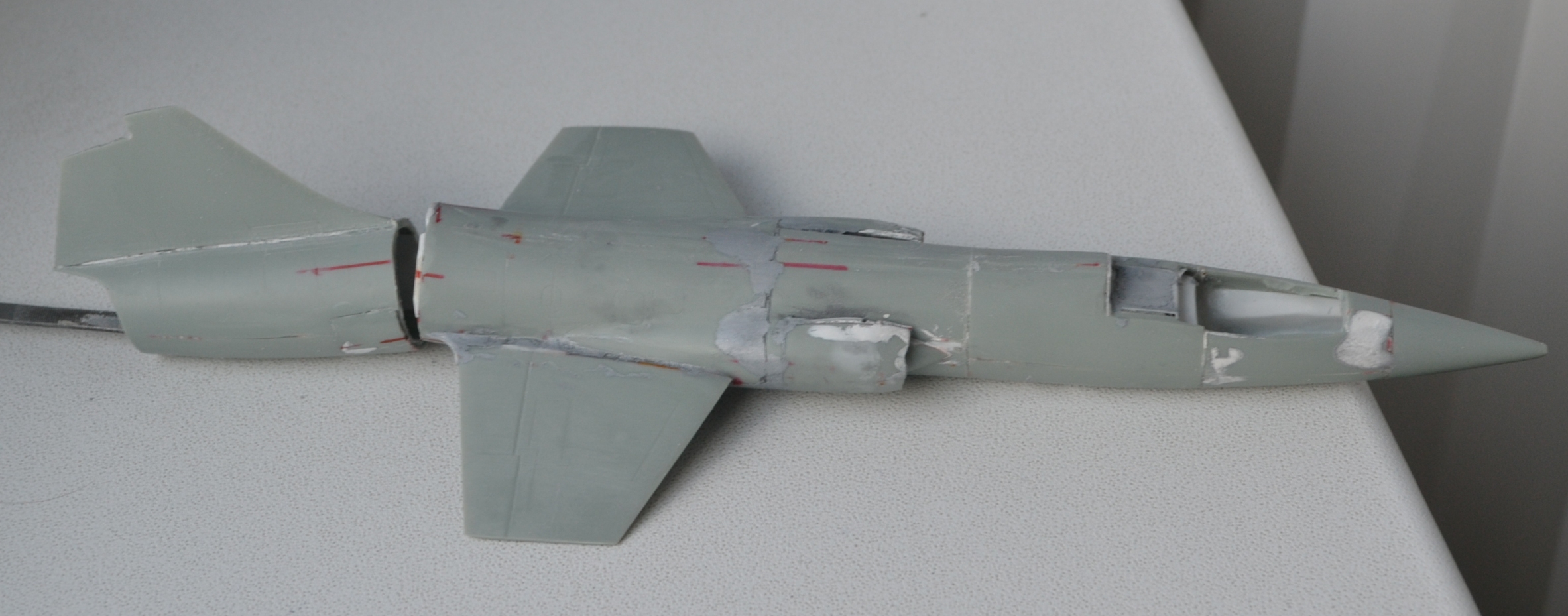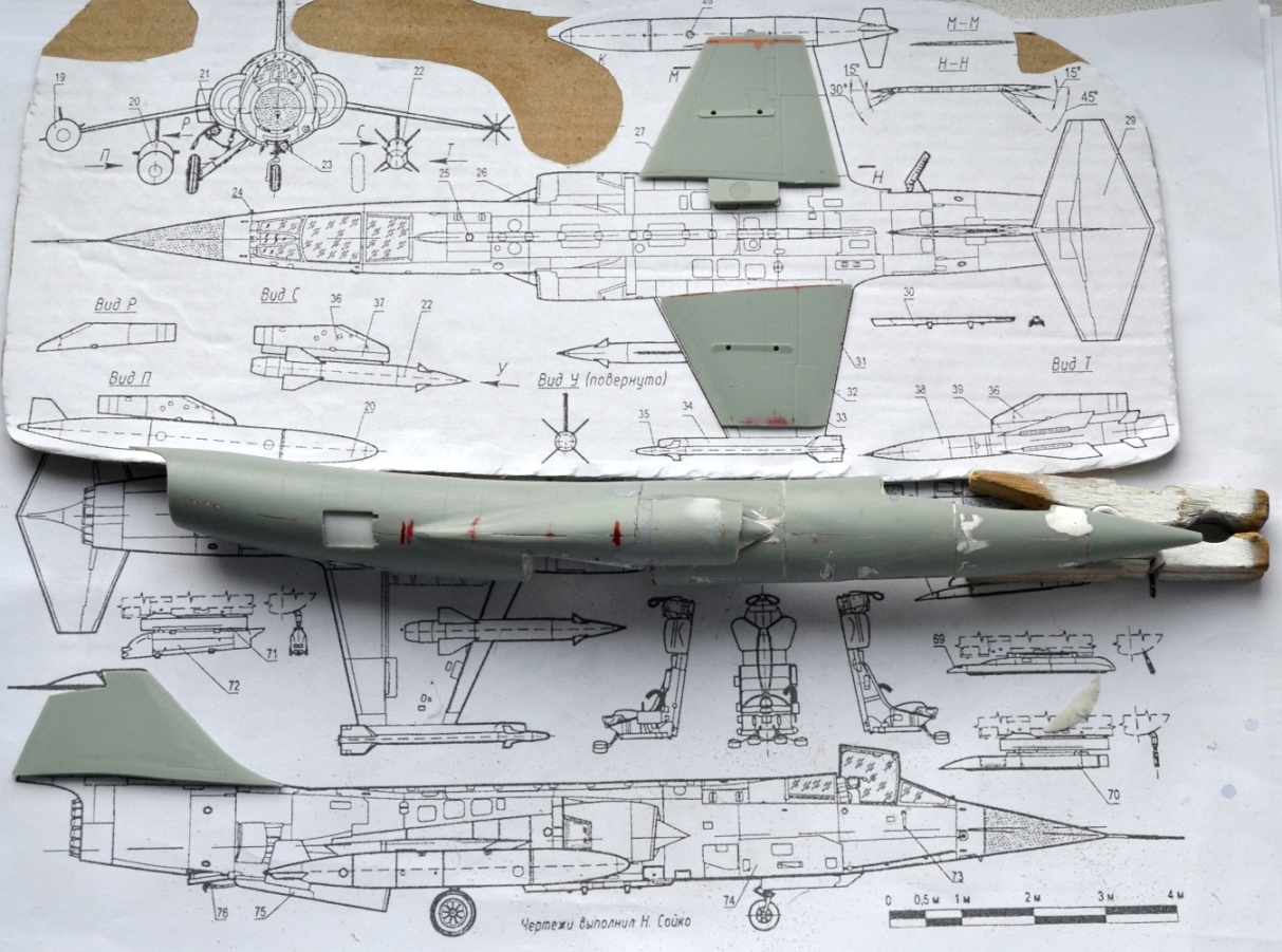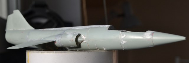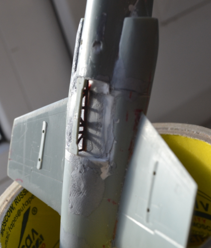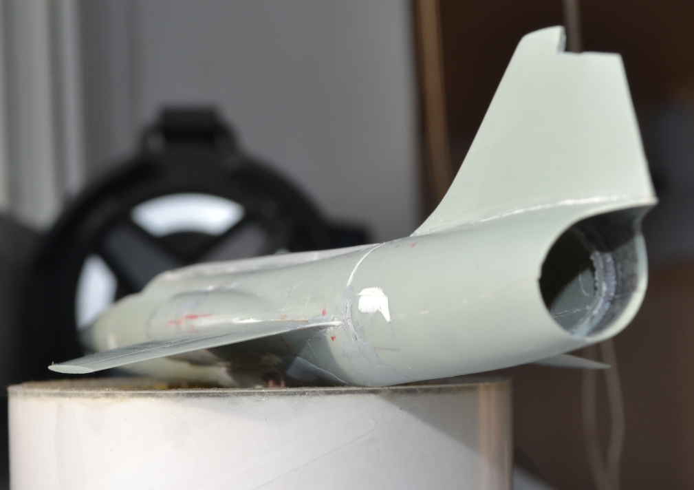 4. После приклеивания воздухозаборников пришлось гладить поверхность сверху и замазывать снизу, т.к. после укорачивания отсеков фюзеляжа пошли ступеньки, а совмещал-то половинки я по верхнему контуру фюзеляжа.