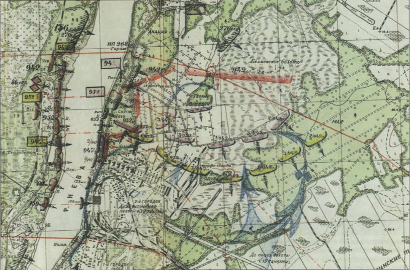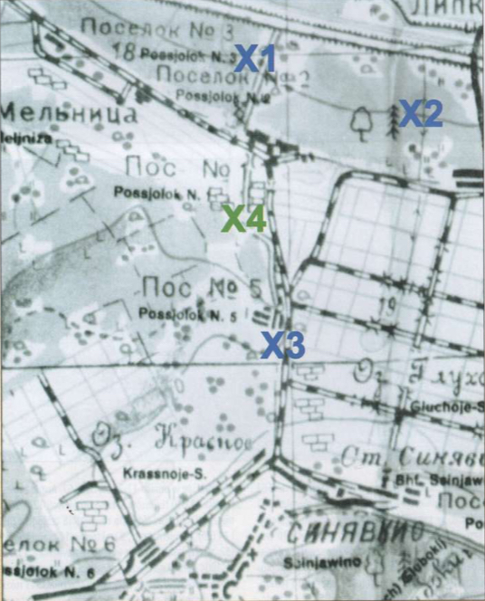 В точке Х1 уничтожен танк с серийным номером 250003, Х2 - 250006, Х4 - тномер 100 (серийный 250009). Х3- местонахождение покинутого танка тномер 121 (серийный 250004)