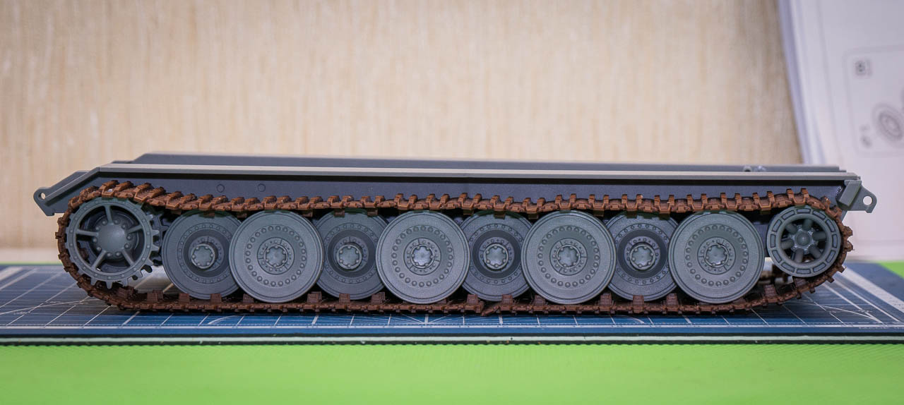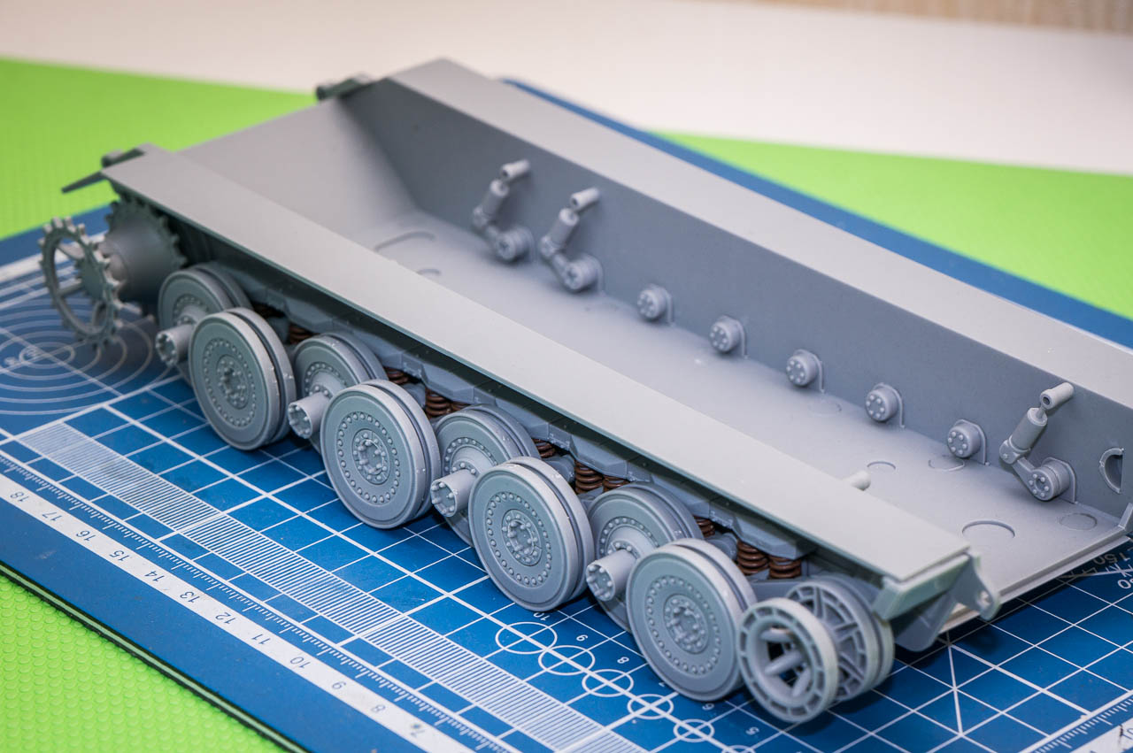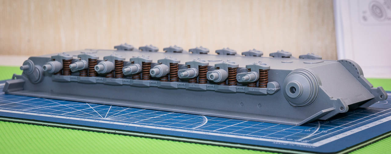Собрал ходовку. Впервые встретил пружины из пластика. Самое смешное что они реально пружинят) У меня опыт с наборами не большой, были ли когда-нибудь еще пластиковые пружины в других наборах? Слышал что на эти пружины жалуются, но я не увидел никаких проблем, когда их все соберешь. Ну есть и есть. Хочешь делай диораму с работой подвески, а не хочешь - ровно выставить не проблема. Проблема может быть с тяжеленными металическими траками, мол когда модель поднимаешь они могут упасть вниз обломав все эти пружинки. Но тогда не проблема законтрить ход подвески просто поставив балансиры на клей. Короче надуманно.