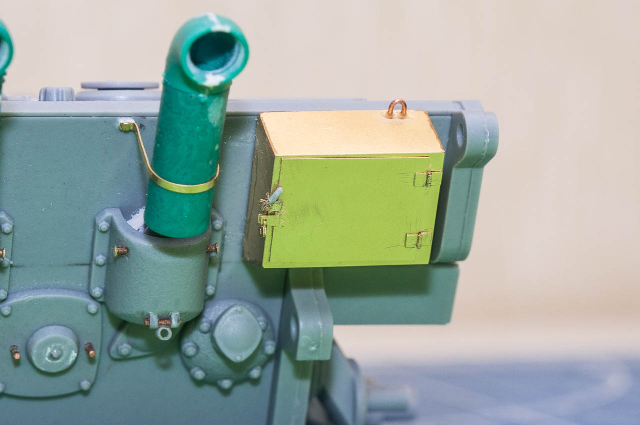 Доделал люк, крепления пускача. Люк конечно получился так себе, но что смог подручными средствами. По ящику сделал то, что захотелось. А захотелось почти все) Рым, вторую пару петель и ручку эту закручивающуюся (которая на крупном плане слегка толстовата, но проволоку клеить к кольцу было не к место), повернул петли с замком наоборот, оторвал "детские" крепления к корпусу, теперь считай на невидимых бонка за задней стенкой. За одно укоротил рымы бронировок выхлопа, длинноваты они вышли. В процессе потерял стопор на конце левого рыма) Пришлось изготовить из пластиковой трубки.