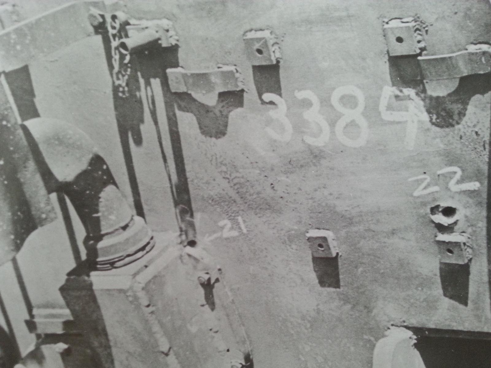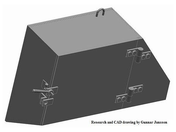5. Сбоку показаны травлёные типа как крепежи: даже если и так, то крепились бы они вряд-ли к корпусу, скорее к бонкам (впрочем, не критично, можно и болты за шляпку приварить и т.д.). Но такие крепежи это ящик не выдержат. Крепился он к 4 массивным бонкам.