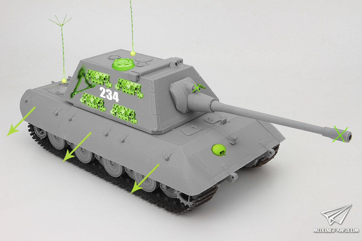 2. Только сейчас отметил... Хомуты на искропламегасителях. Стоило делать как на "Пантере". Так "обнимать" кожух нет смысла: он с тыльной стороны приваривался к поддерживающей пластине, на "Пантерах" это частый косяк моделистов: заменить пластину на травление а имитацию её приварки не дать.