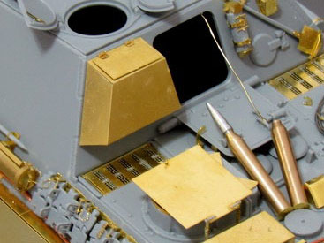 Так же добавляю всякие крюки, инструменты, огнетушители, тубусы по корпусу, в основном сзади. Все это из набора травления для Е-100 от Trumpeter. Проблемы там с сетками, от Trumpeter не подходят по размерам, а в наборе они ужасные. Но я придумал как их скрестить, покажу позже, когда дойдет до дела. Так называемую защиту вентиляции от авиации делать не буду, всегда не нравились эти странные листы фольги.