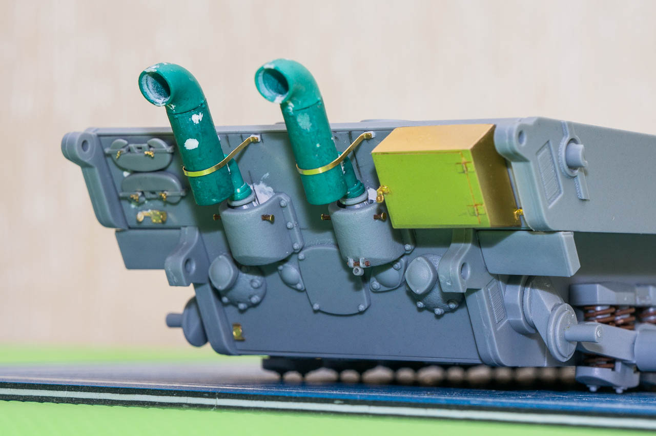 Добавил пламегасители, естественно от Пантеры. Исходный крепеж к корпусу был слишком высок, поэтому изготовил новый крепеж самостоятельно, расположил чуть ниже, на стыке кормы и МТО.