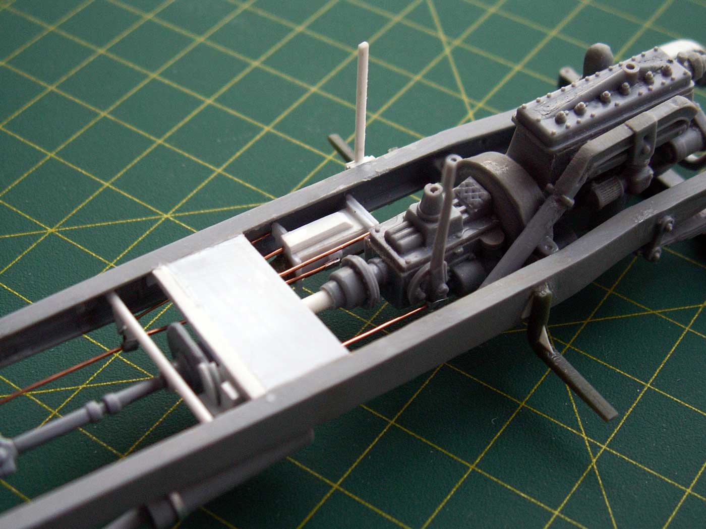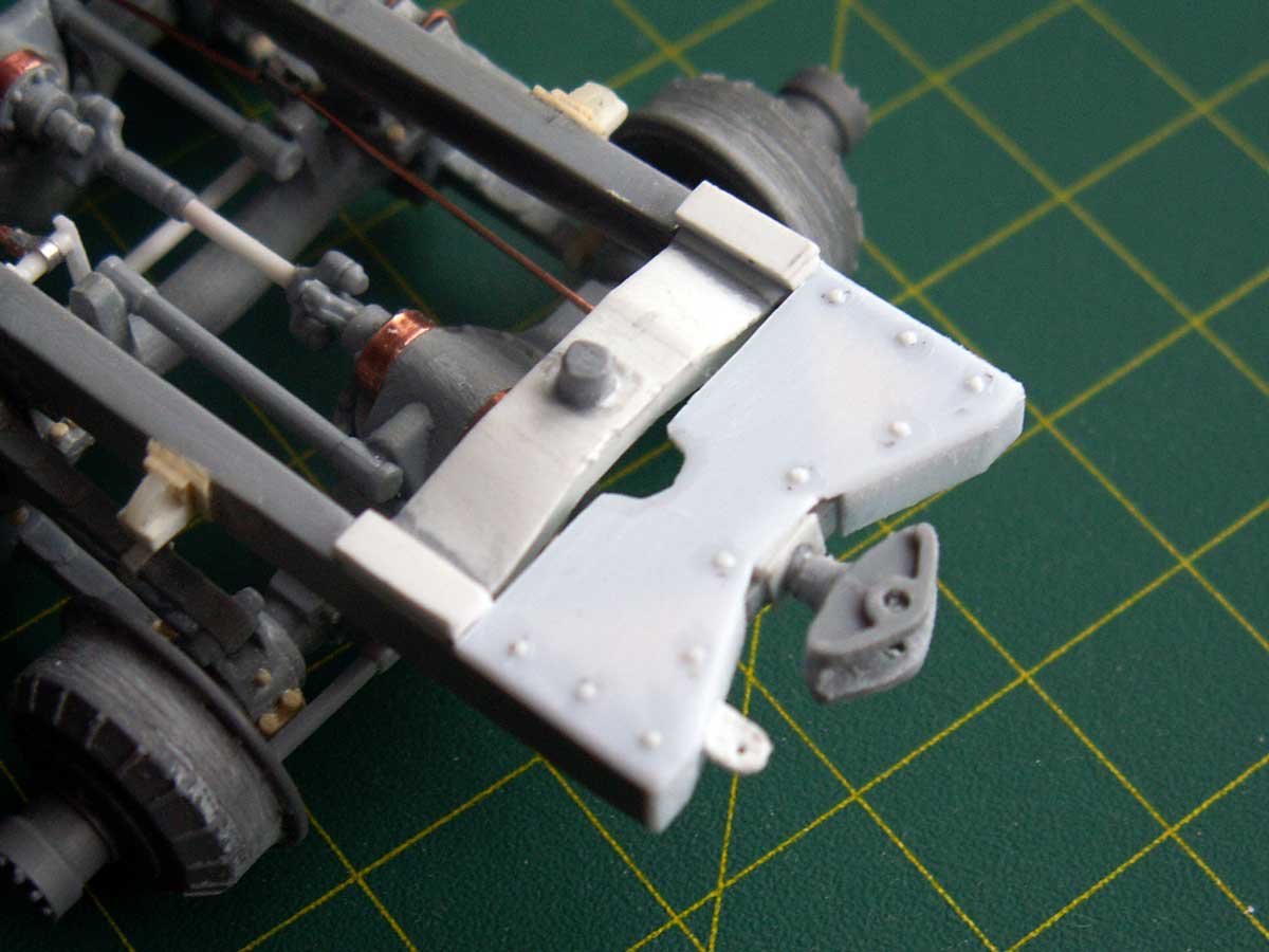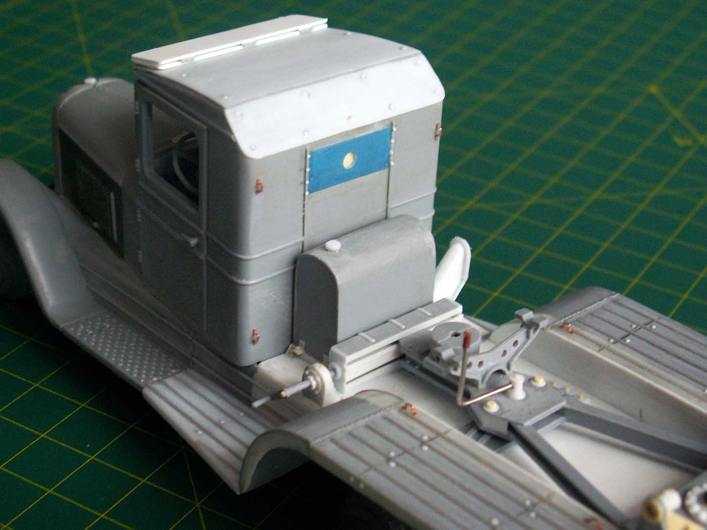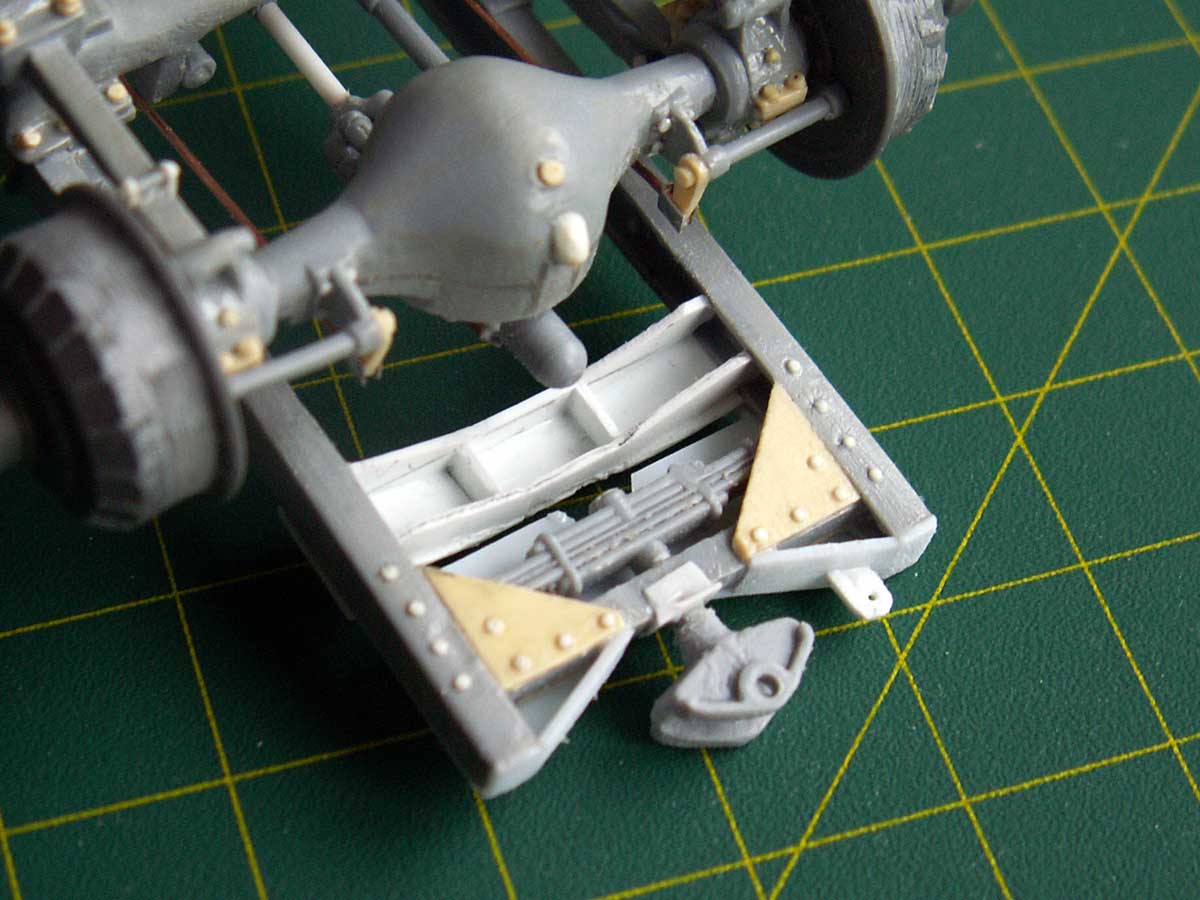 Задняя часть с крыльями совсем не подходит для данного экземпляра. Крылья непонятной формы, что-то похожее на подрамник... Пришлось переделывать. Все крепилось к кабине. Сделаны бак с креплением, рейка механизма горизонтальной наводки, кронштейн запасного колеса и так, по мелочи... винтики, шаечки ))))
