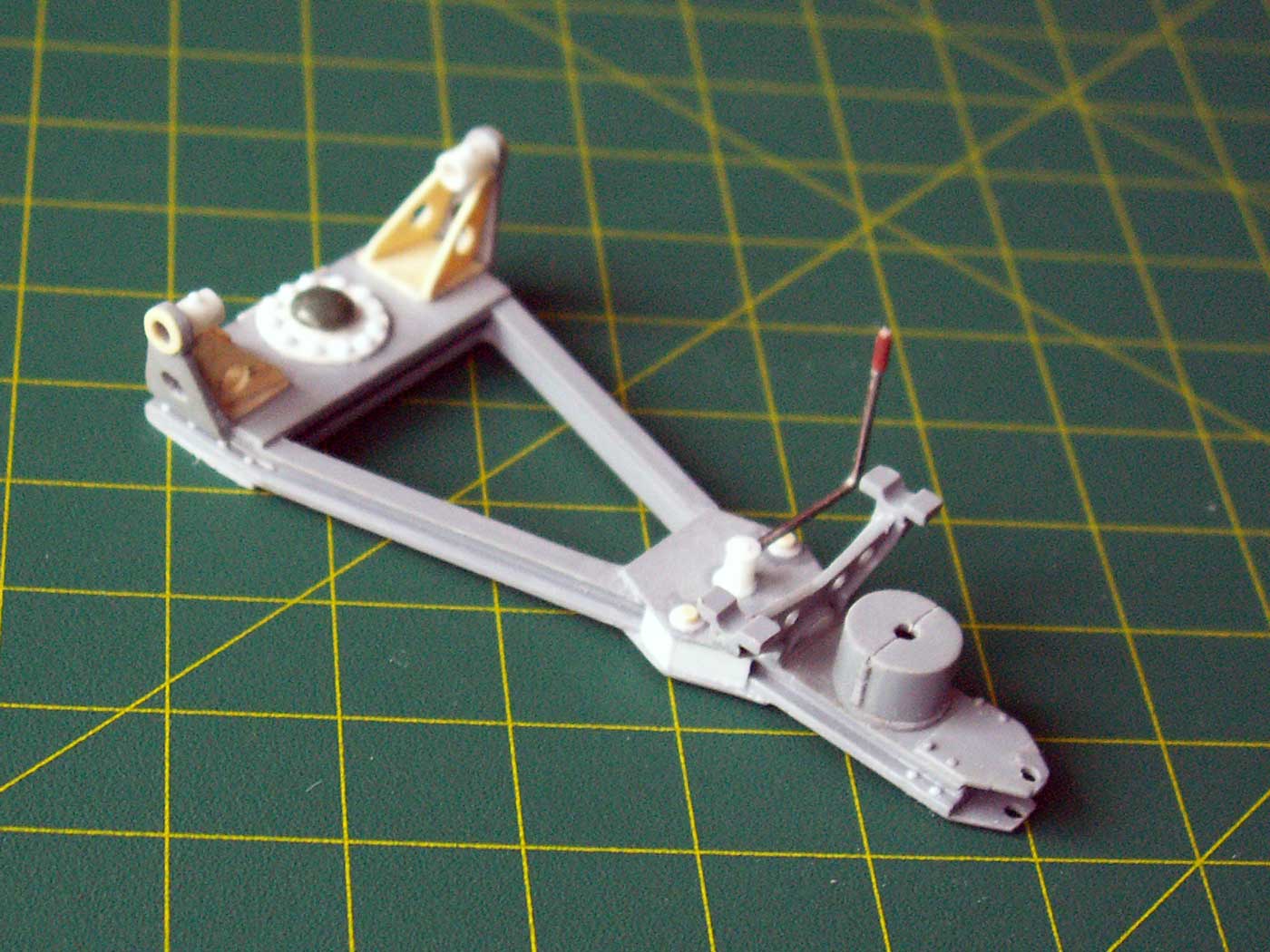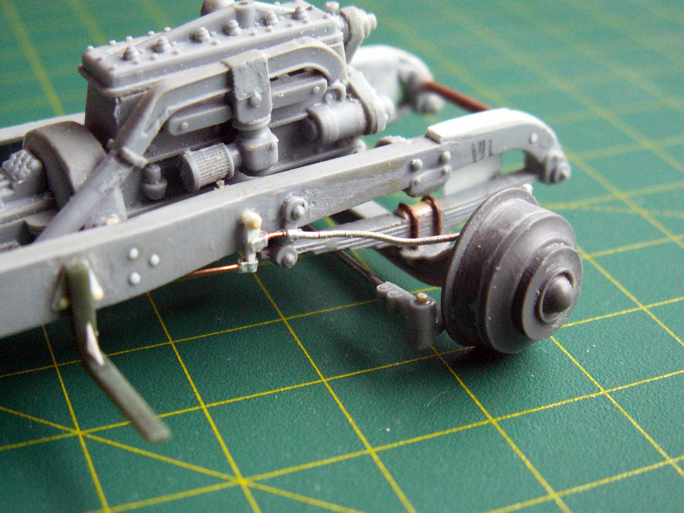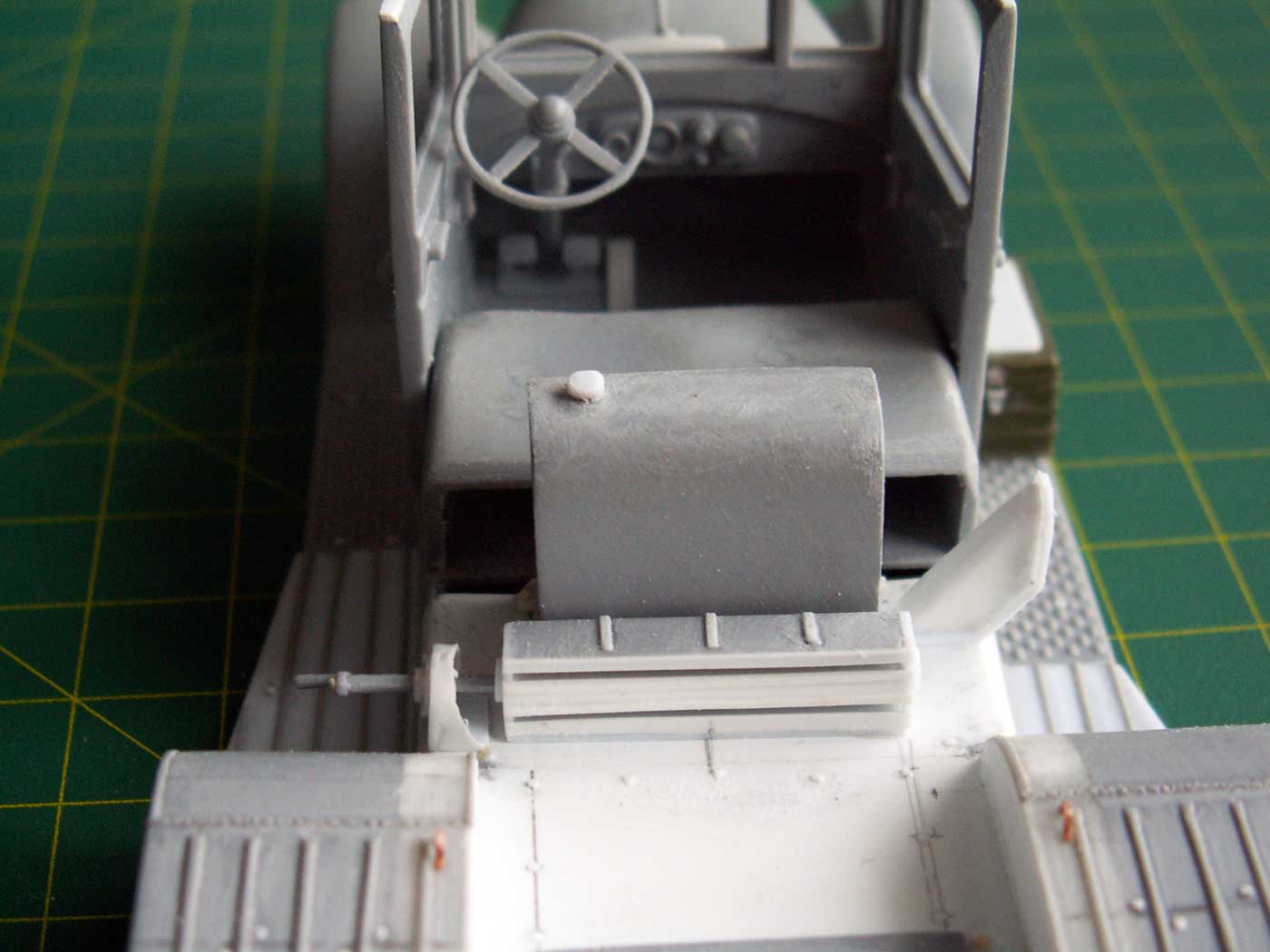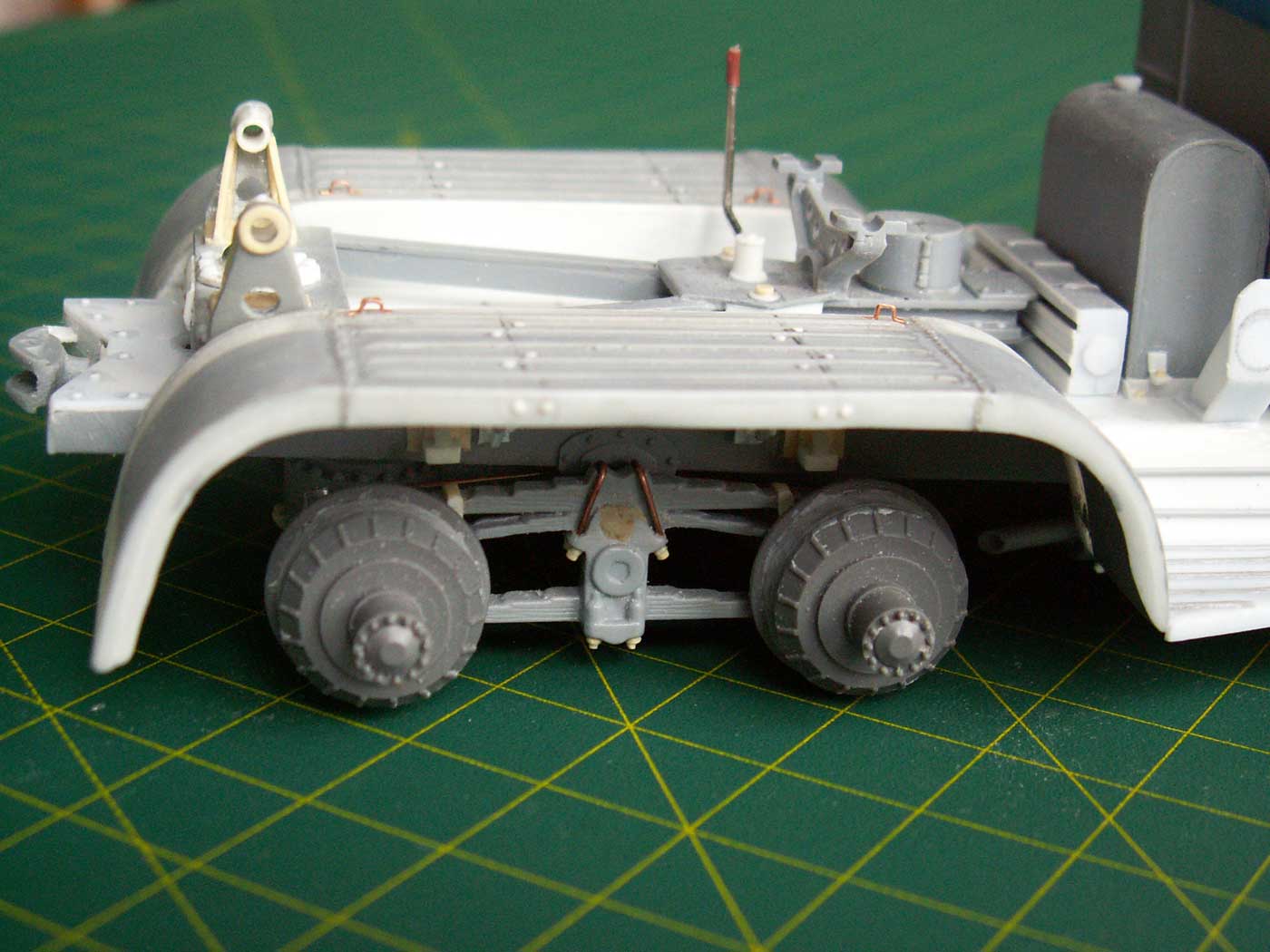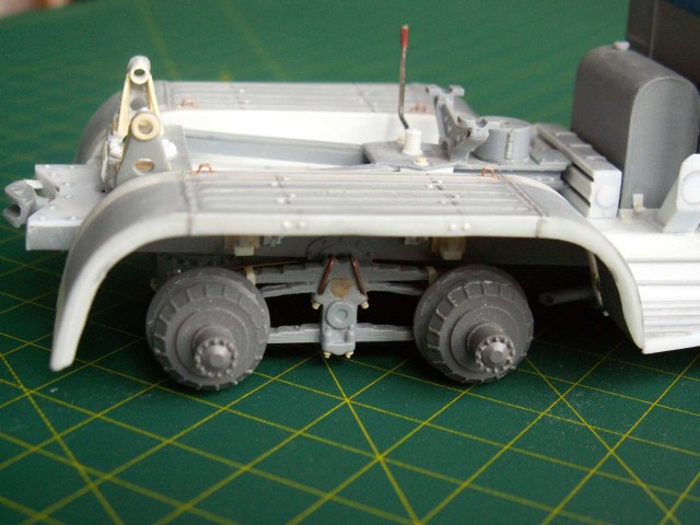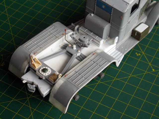 Задняя часть с крыльями совсем не подходит для данного экземпляра. Крылья непонятной формы, что-то похожее на подрамник... Пришлось переделывать. Все крепилось к кабине. Сделаны бак с креплением, рейка механизма горизонтальной наводки, кронштейн запасного колеса и так, по мелочи... винтики, шаечки ))))