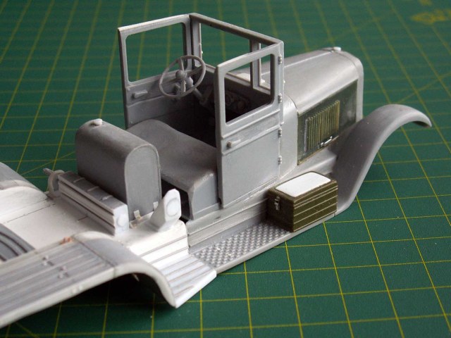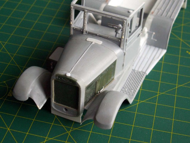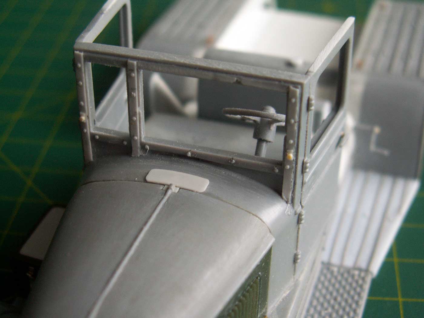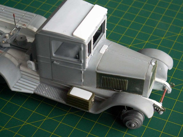 Крылья, радиатор, капот, передняя стенка кабины, двери собраны воедино. Крылья кое-где сточил, кое-где нарастил руководствуясь фотографиями реальных машин. Створки капота поменял на то, что валялось в коробке с хламом (вроде от ЗИСа ТОКО). Радиатор доработан тоже деталями от ТОКО, вставлена новая эмблема и радиаторная решетка. Переделал обрешетку лобового стекла, добавил демпферы для защиты стекол при опущенной защите, крышу капота подкорректировал, ну и мелочи всякие...