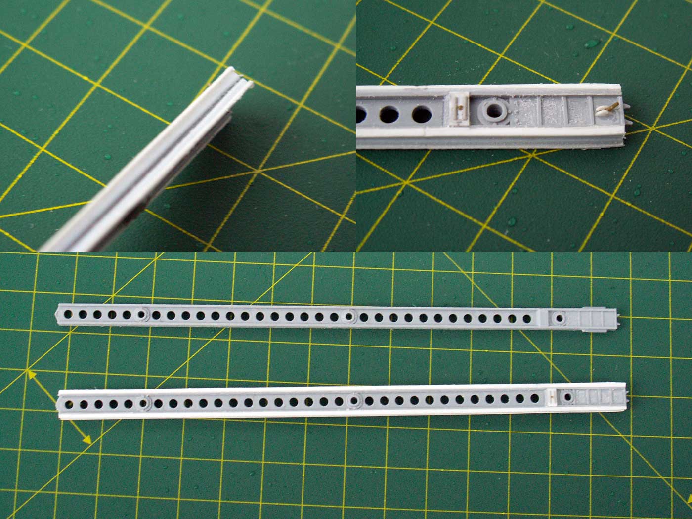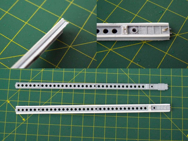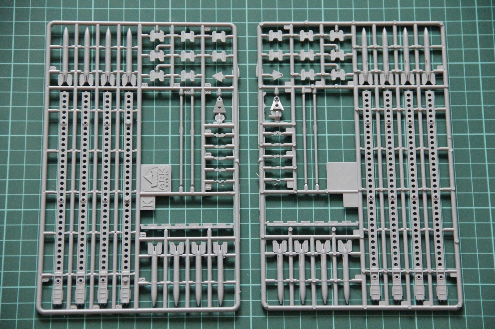 Второй и третий - элементы направляющих и РСов. Качество вполне, хотя на направляющих заметные утяжины в "казенной" части и следы толкателей на ажурной части. Есть кондуктор для сборки пакета направляющих, что само по себе неплохо, хотя надо выверять расстояния.