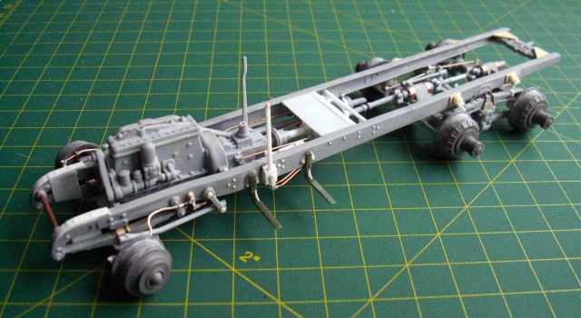 Немного подделал раму - установил шкворневой брус, заднее буксировочное устройство, передние крюки (на литниках их нет, пришлось позаимствовать в коробке с разным хламом).