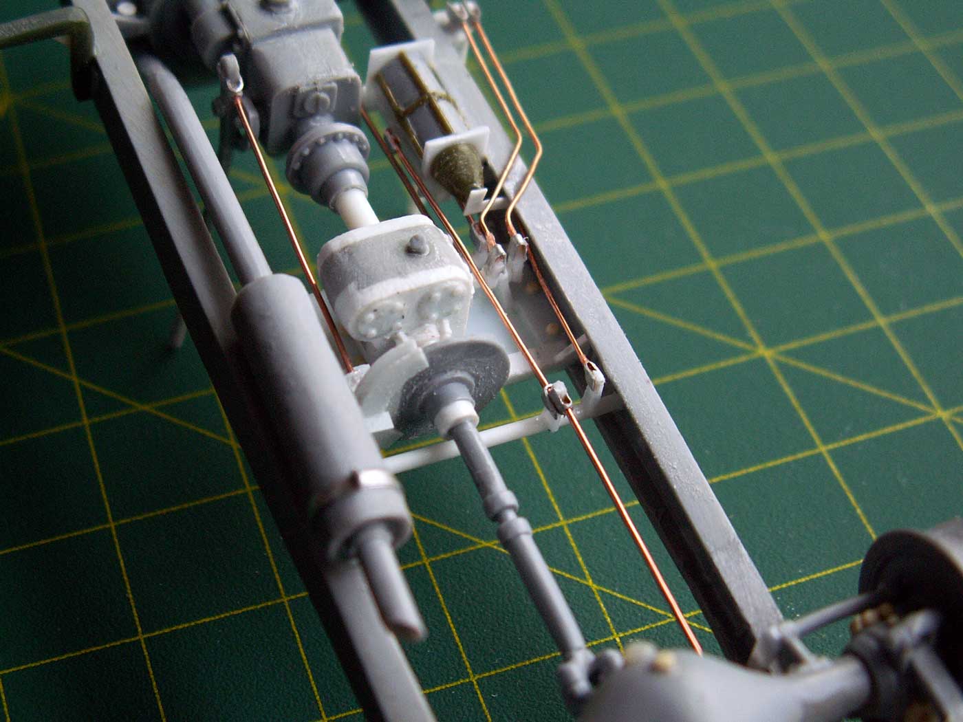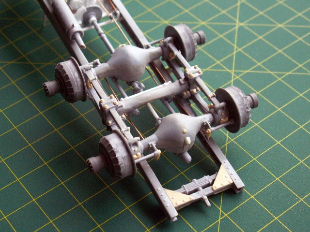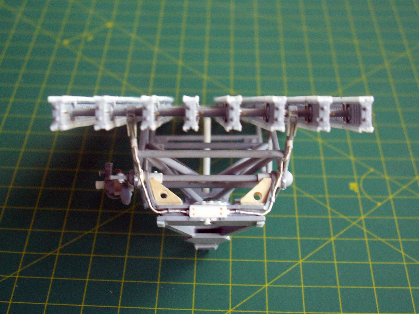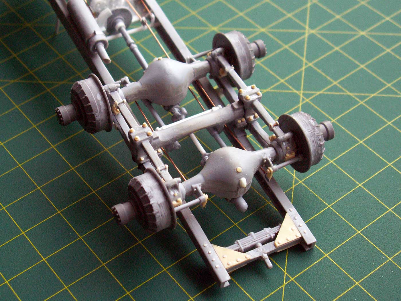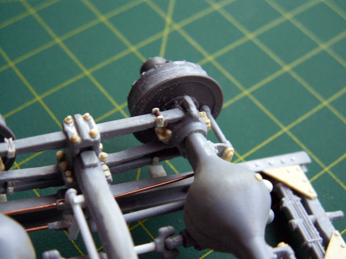 [JUSTIFY]- доработал заднюю тележку. Конечно в большей мере это украшательство, хотя и старался придерживаться фото. Тележка на прототипе изобилует стяжками, болтиками, стремянками и т.п., в модели все это практически отсутствует, плюс средняя ось не прямая, а с изгибом под вал, что в модели не учтено. Мосты тоже требуют доработки...