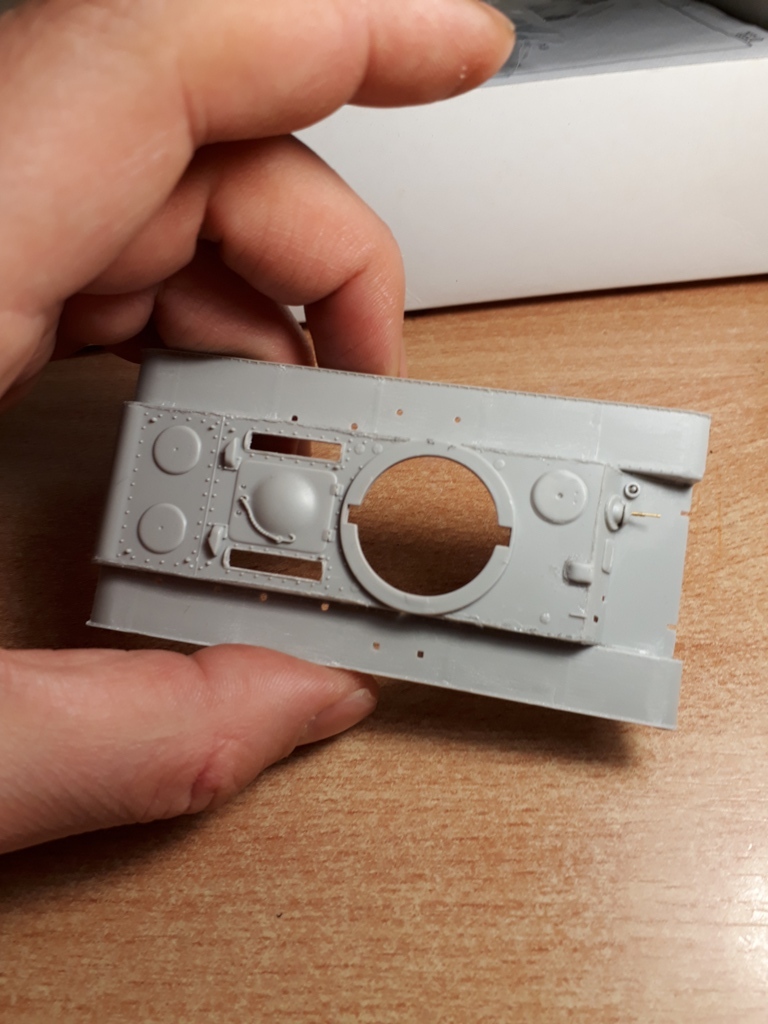 Продолжаю мучить верхнюю часть корпуса...Снес все косынки, выдолбил смотровой прибор мехвода, прорезал смотровую щель, вырезал выхлопные трубы. Не удержался, заменил курсовой пулемет на Zedval. Смотрится неплохо, но ДТ от Zedval это две цилиндрические детали, одна из которых ствол, а вторая кожух возвратно-боевой пружины. Соединить все это в единое целое на суперклей предлагается моделисту...После установки удивился - из шаровой выглядывает всего 1/5 от общей длины получившегося пулемета. Возникает вопрос, зачем такой перерасход материала? Народ, кто-то знает на танках выпуска июня 1941 смотровой прибор мехвода был на болтах или на сварке? Пока не нашел фото четкого...Ну и общий вид сделанного