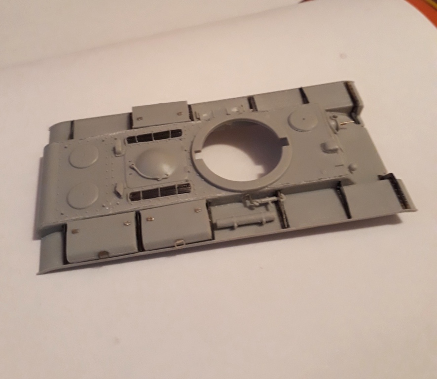 Дальше наступил праздник. В перерывах между поздравлениями, начал работу с травлом. Не очень я люблю работу с металлом, мне пластик или бумага ближе, но ничего не поделаешь. Да и в итоге травление влияет благоприятно на внешний вид модели. Установил не без труда сетки и косынки на надгусеничные полки.